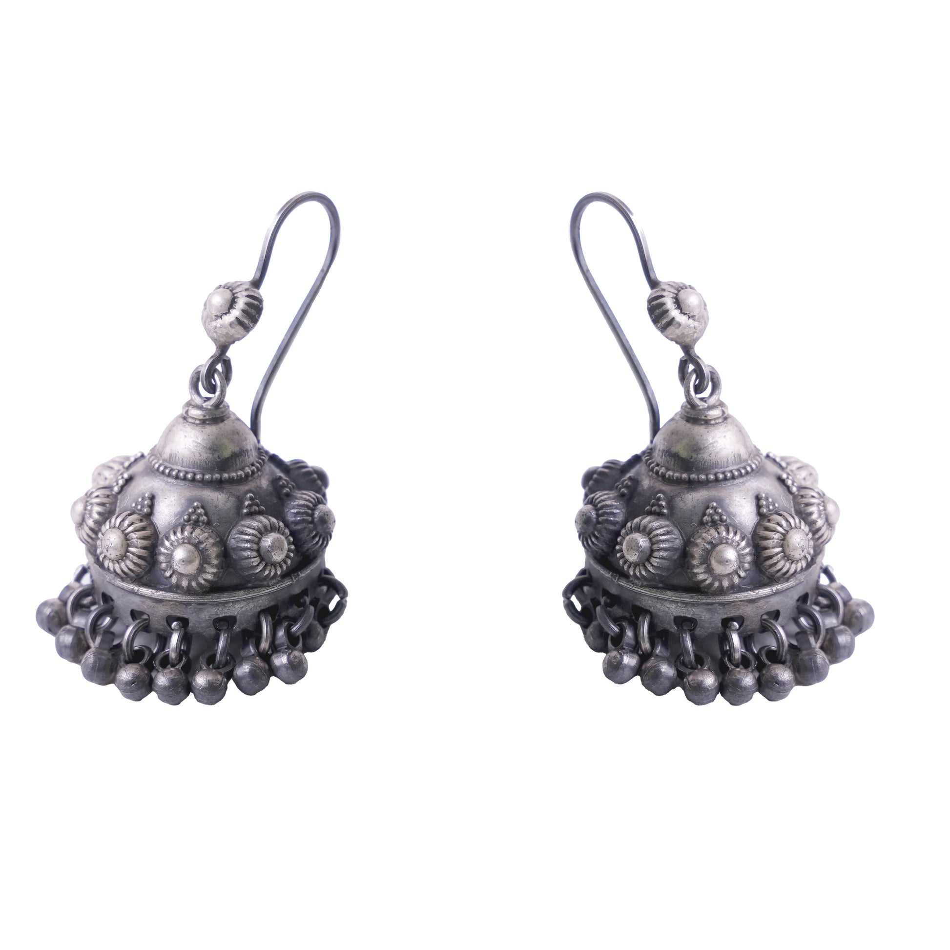 Celebrate timeless tradition with these handcrafted antique-finish jhumkas, designed in pure silver with intricate floral motifs. The dome-shaped body is adorned with classic bead danglers, exuding old-world elegance and artisanal charm. Perfect for ethnic outfits, temple wear, or cultural gatherings — these jhumkas are a tribute to India’s rich jewelry heritage.