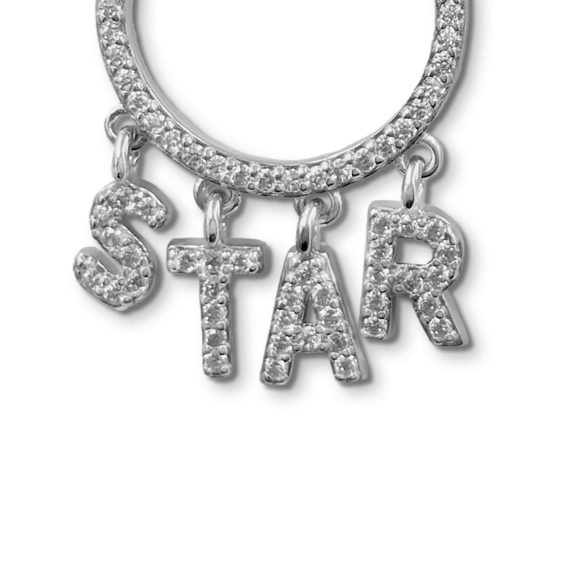 Shine bright with our Celestial STAR Hoop Earrings, crafted for the dreamers and stargazers. Featuring a dazzling circular hoop adorned with a hanging moon charm and bold, crystal-encrusted “S-T-A-R” letters, these earrings radiate cosmic charm. Finished in a luxe 925 silver tone, they are perfect for adding a playful yet glamorous vibe to your outfit — whether you're headed to a concert, party, or just channeling your inner star.