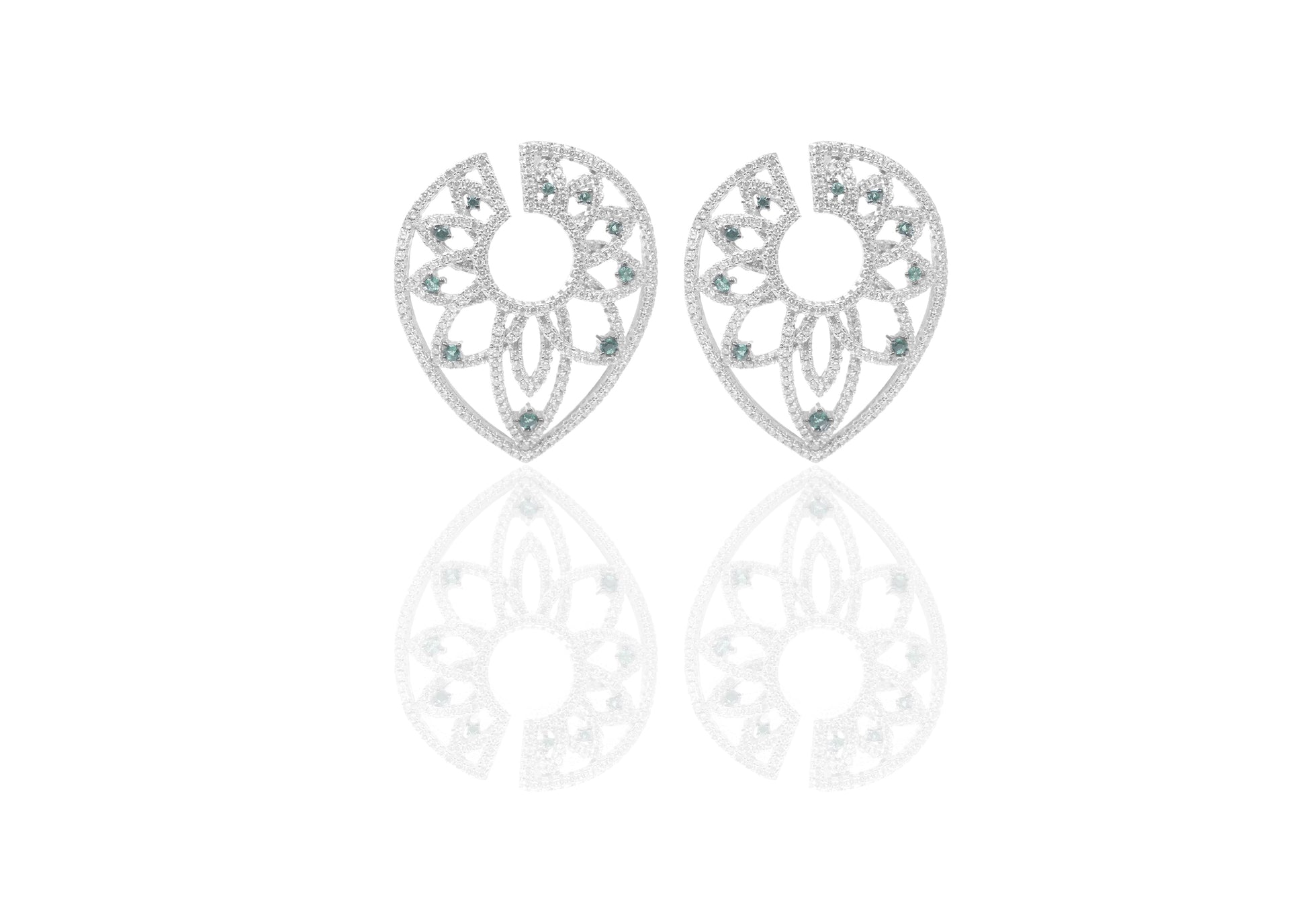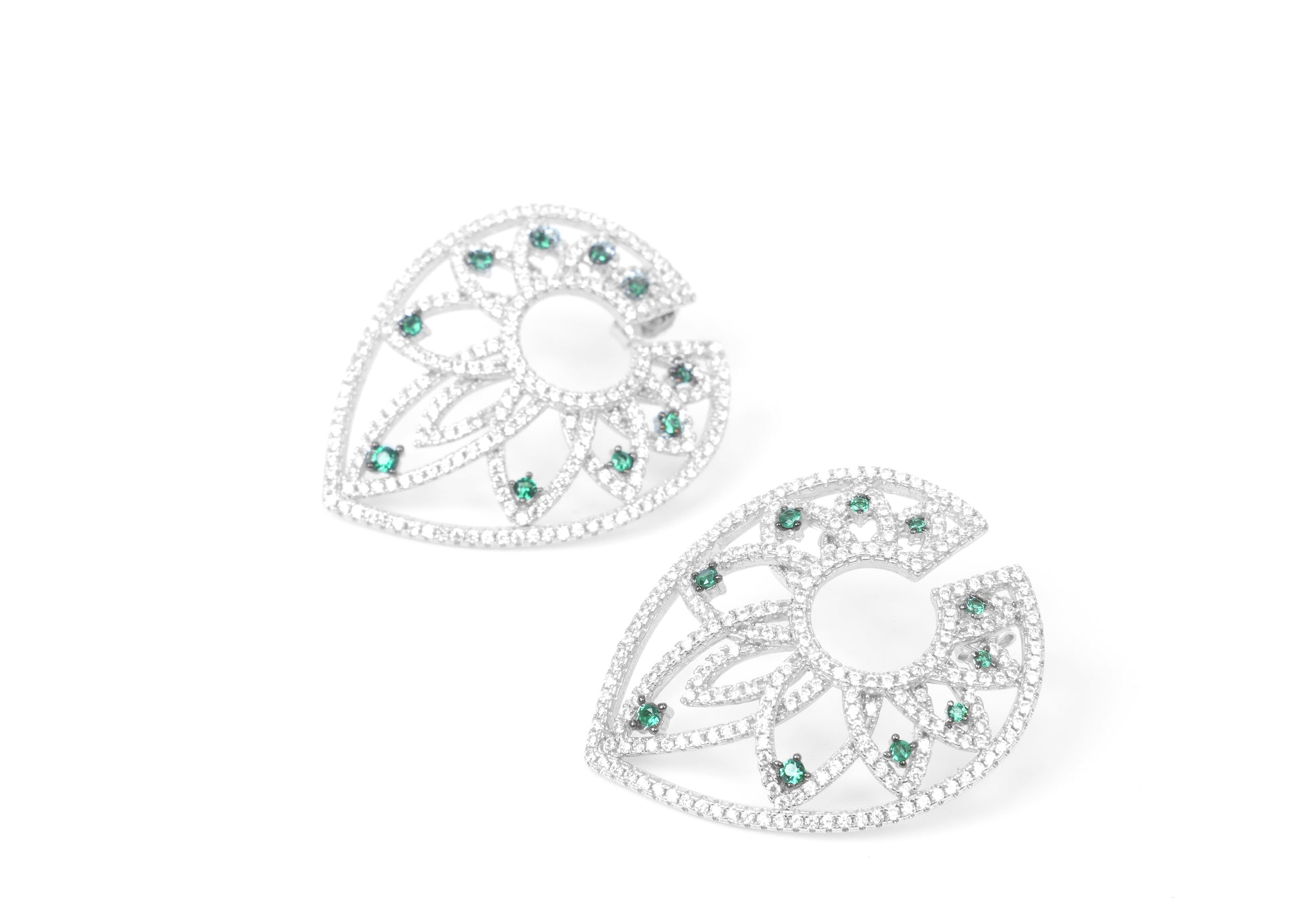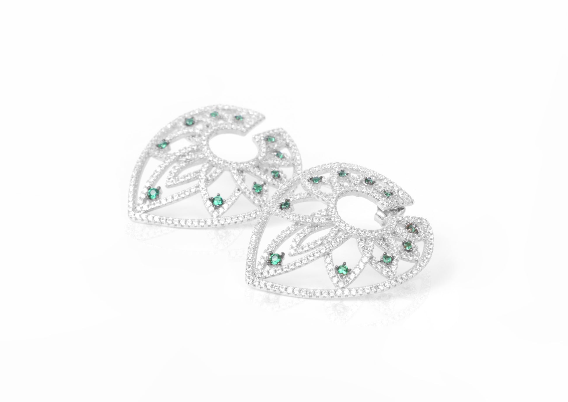 Inspired by nature and crafted in pure silver, the Emerald Bloom Silver Studs are a graceful blend of symmetry and sparkle. The floral-inspired openwork design is delicately accented with vivid green stones, creating a refreshing contrast against the shimmering silver. These earrings bring a contemporary twist to classic elegance, perfect for both festive occasions and elevated everyday style.