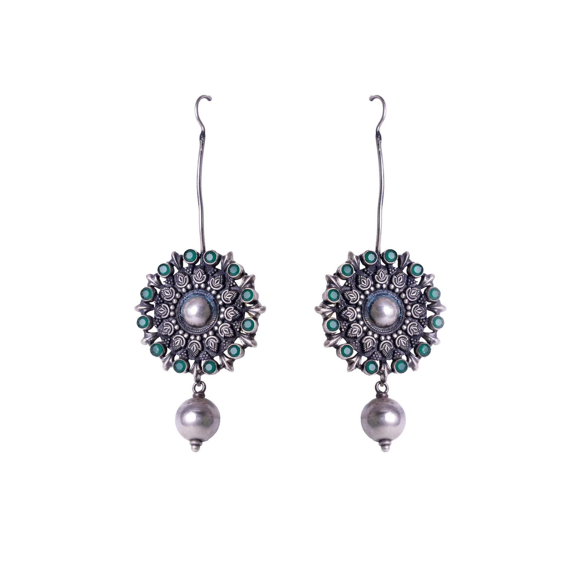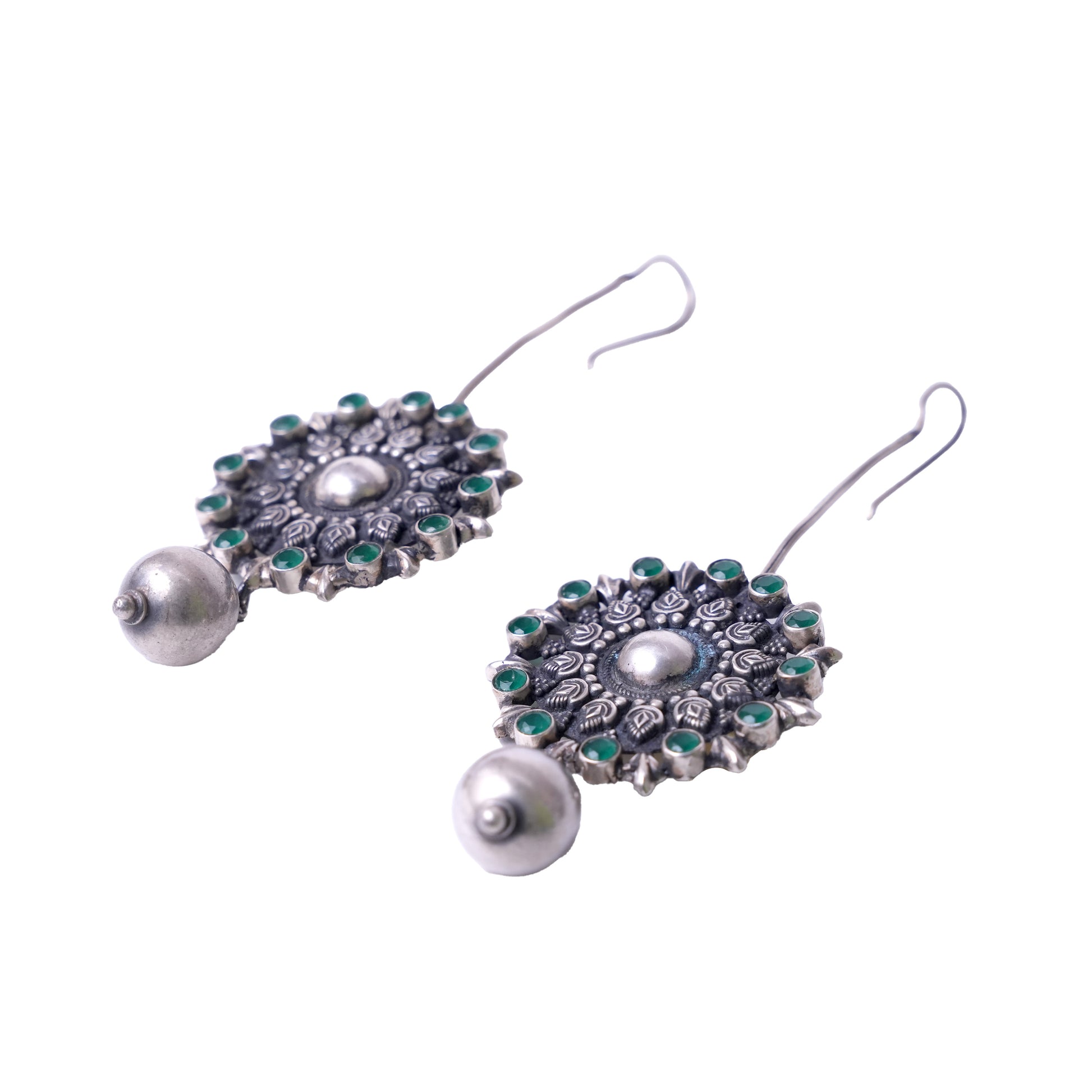 These exquisite jhumka earrings showcase detailed silver work, accented with green stones and dangling pearls, ideal for adding elegance to any traditional ensemble.