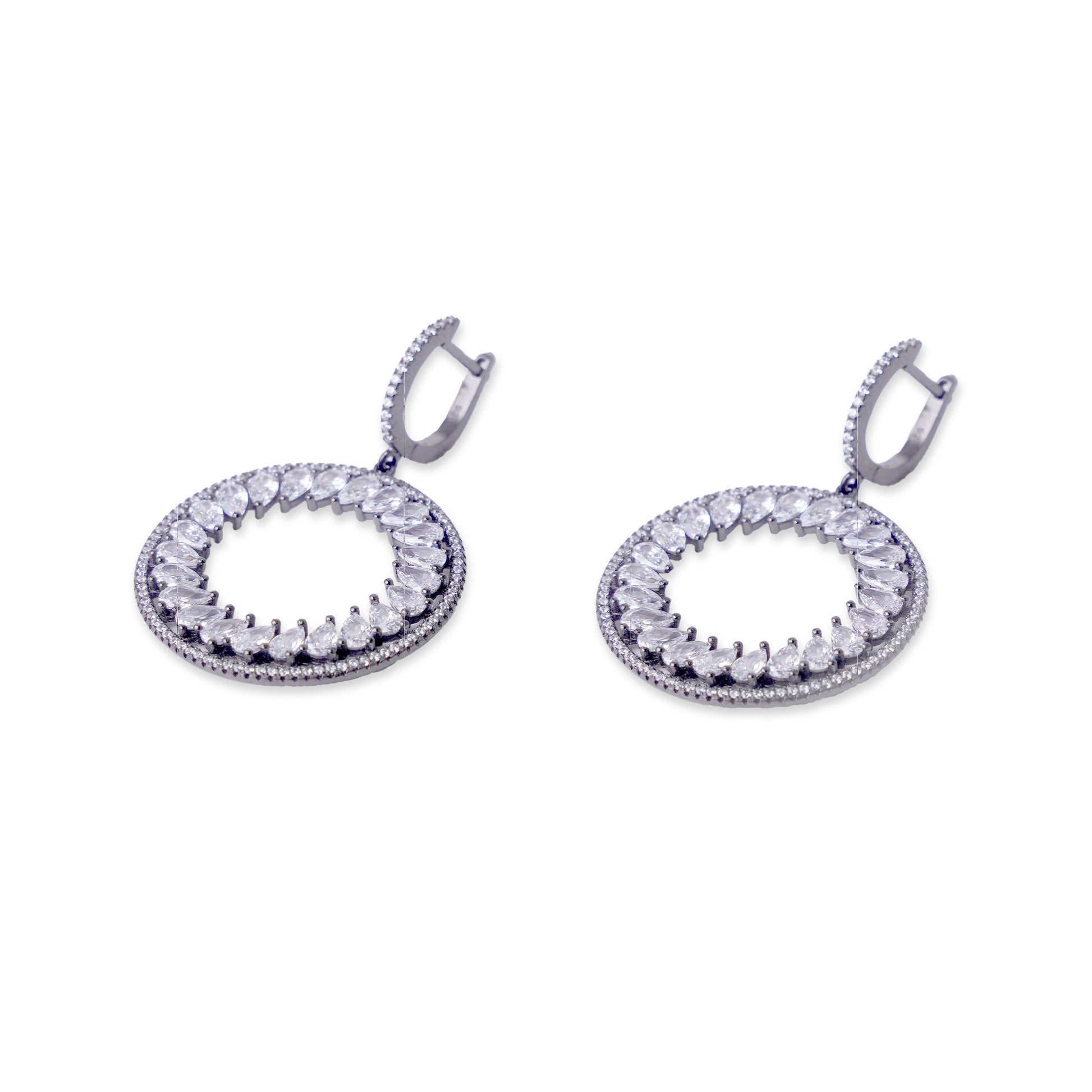 Turn heads with these stunning circular jhumkas, meticulously crafted in sterling silver and adorned with dazzling zircon stones. The unique open-halo design features teardrop-cut stones arranged in a swirling pattern, symbolizing grace and eternal beauty. Perfect for weddings, parties, or a glamorous evening out — these jhumkas bring a modern twist to traditional elegance.