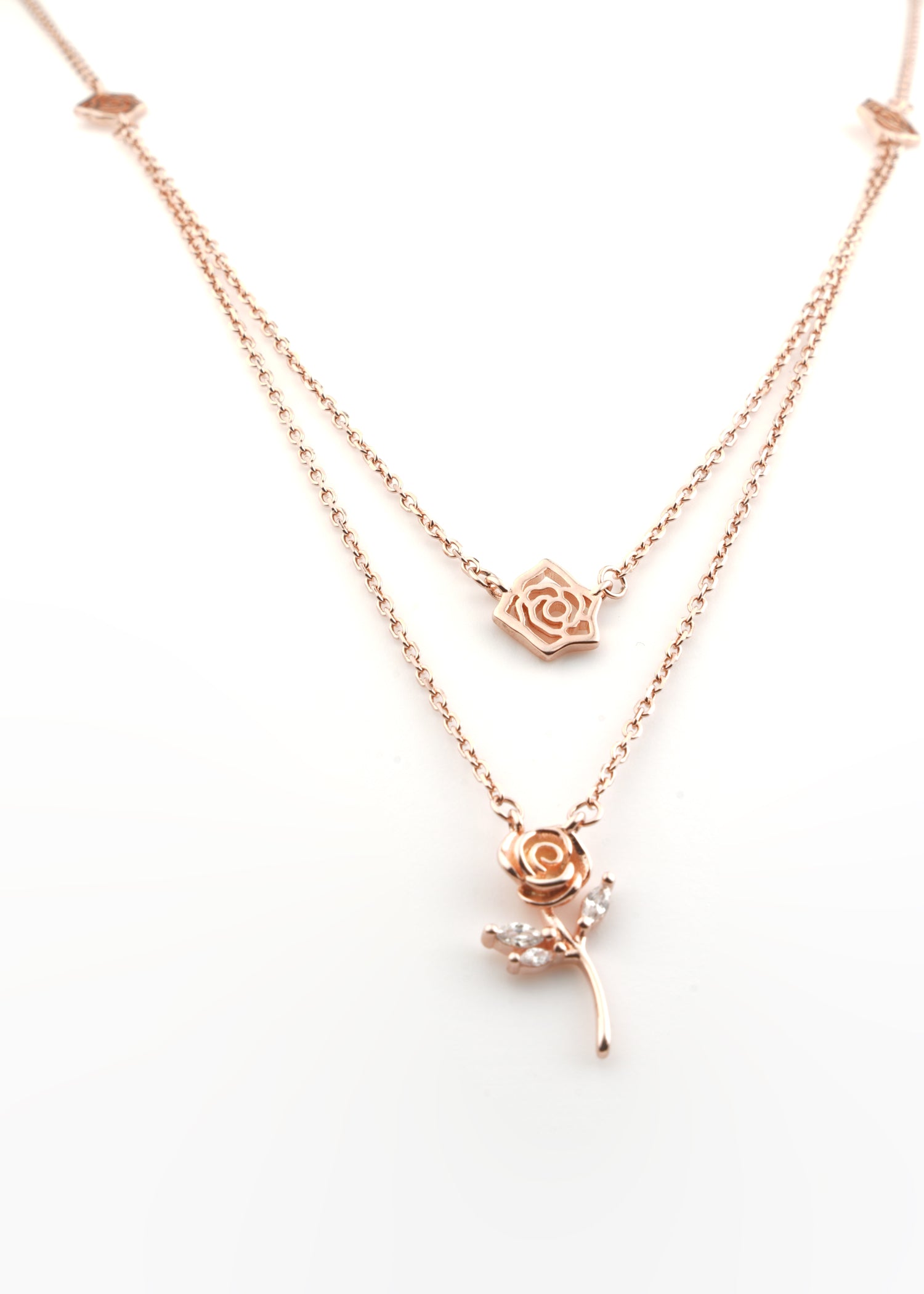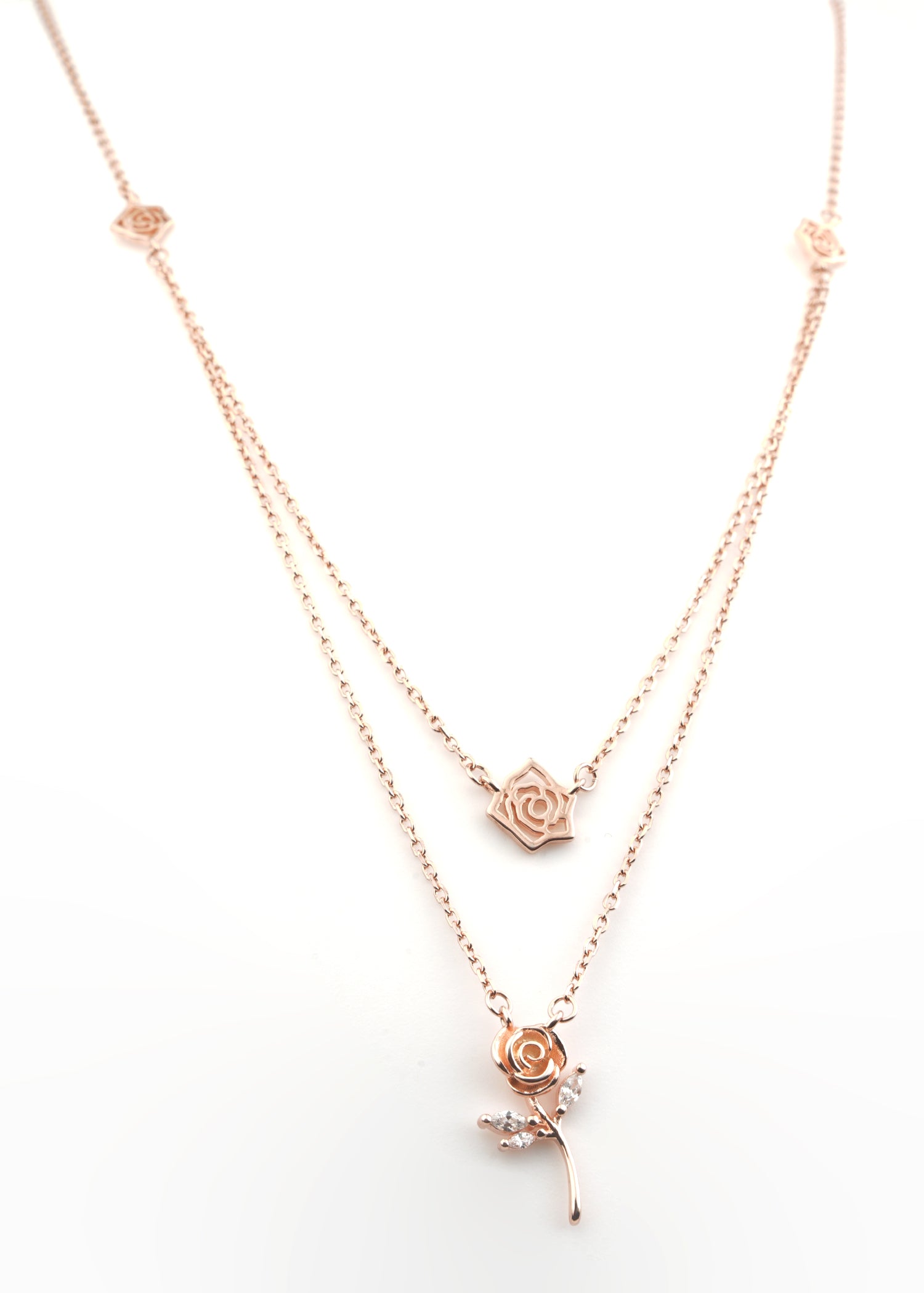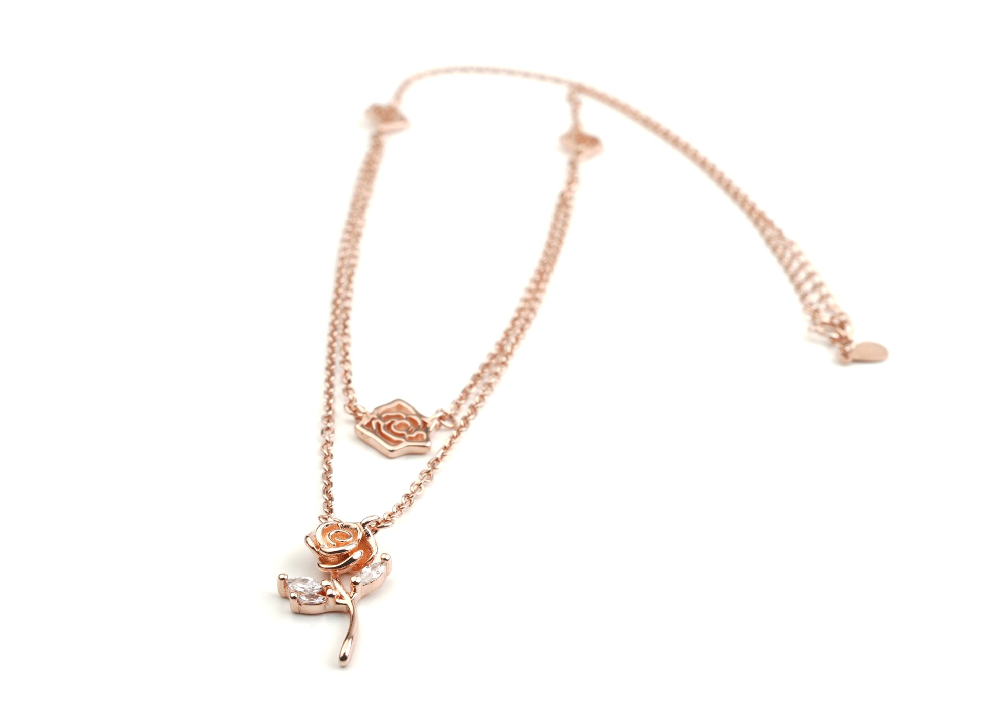 This stunning rose gold necklace features a double-strand design with delicate rose-shaped pendants. The longer strand showcases a detailed rose with small gemstone accents on the leaves, while the shorter strand is adorned with additional rose motifs for a layered effect. Perfect for adding a touch of elegance to any outfit.