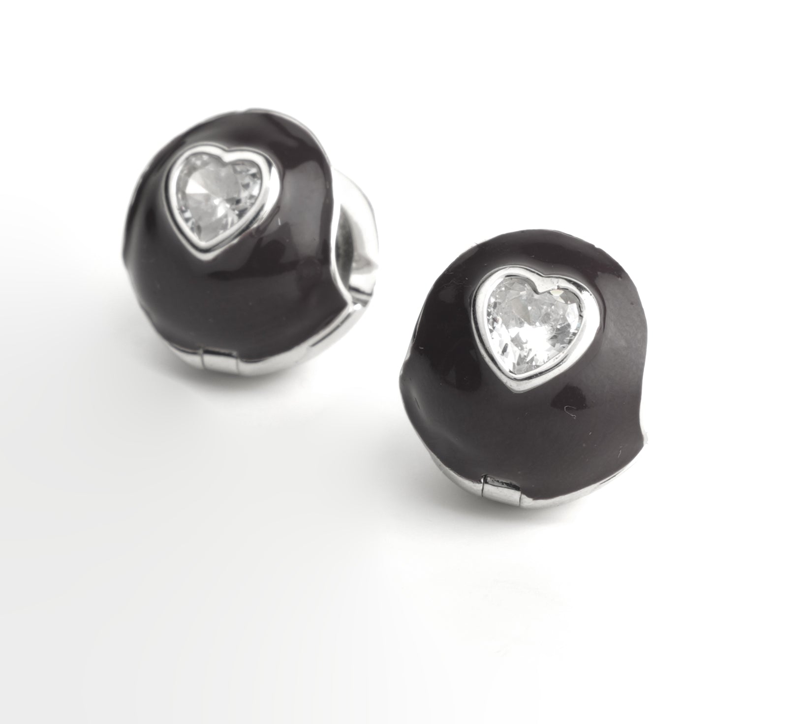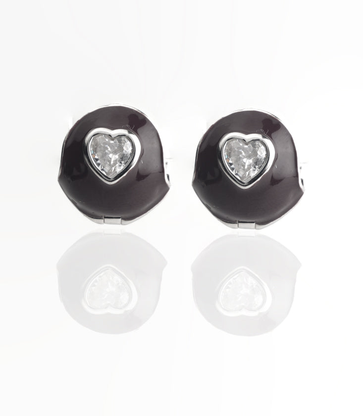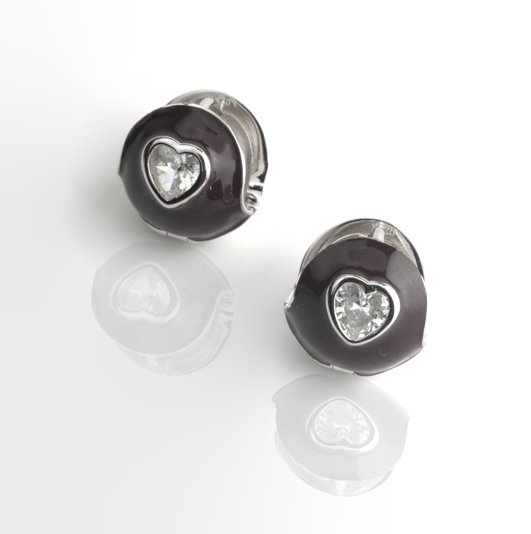 These charming silver stud earrings feature a glossy black dome, each accented with a heart-shaped gemstone set in the center, adding a touch of sparkle and romance. The combination of the sleek silver base and the deep black finish creates a striking contrast, making these earrings a versatile accessory for both casual and formal looks. Crafted from high-quality silver, they are lightweight and comfortable for all-day wear.
