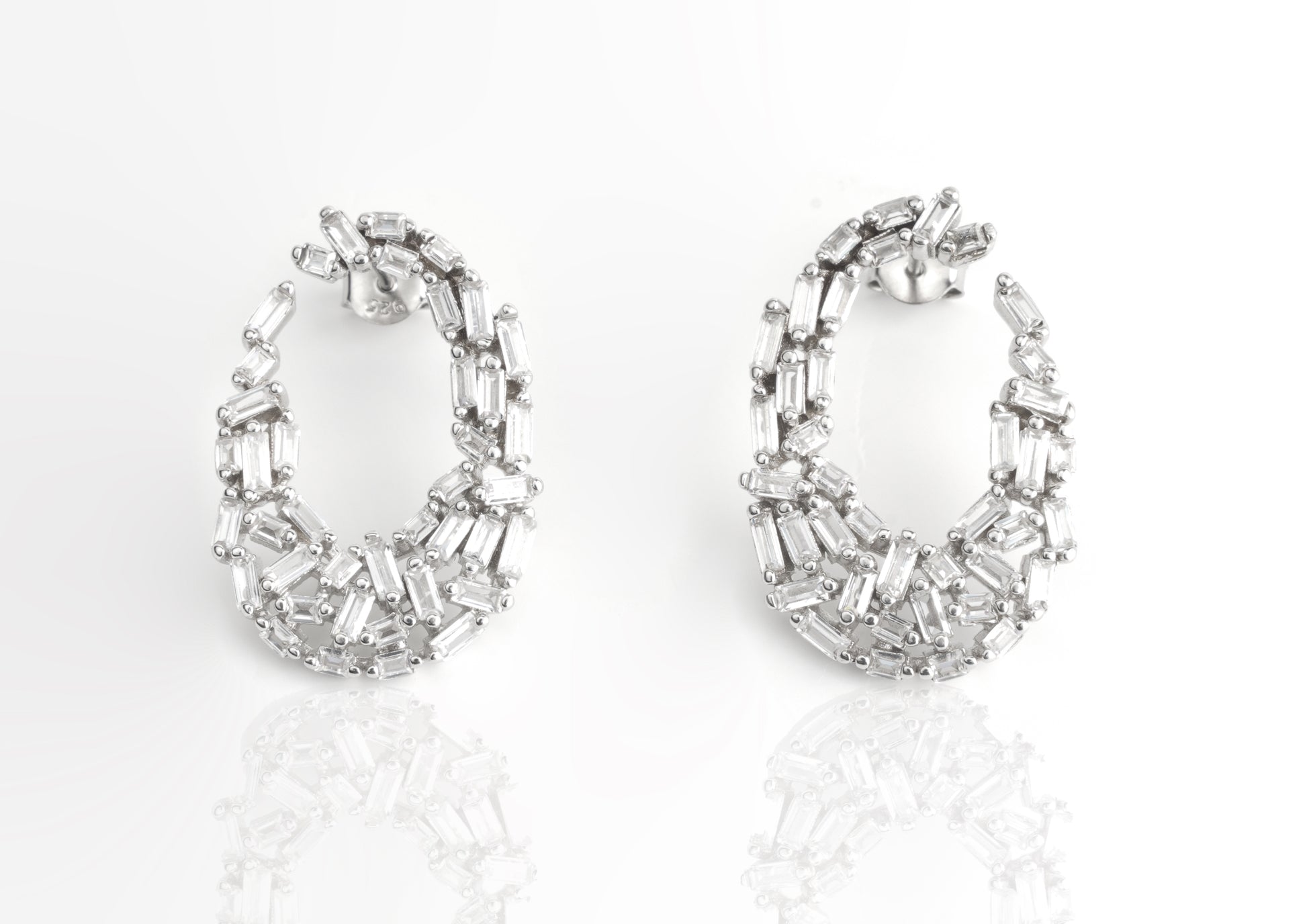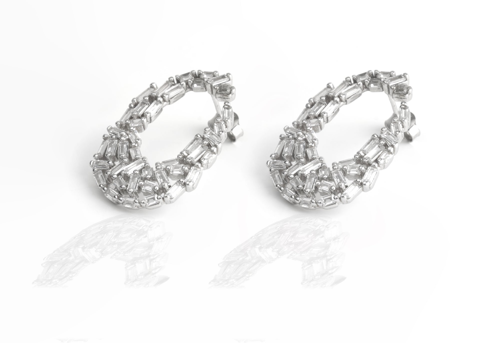 These striking silver hoop earrings feature a cluster of baguette-cut gemstones arranged in an elegant, curved design, creating a shimmering, textured effect. The stones are intricately set to form a semi-circle, adding a modern yet glamorous touch. Crafted from high-quality silver, these earrings are perfect for adding a bold sparkle to both casual and formal looks. Their lightweight construction ensures comfort for all-day wear.