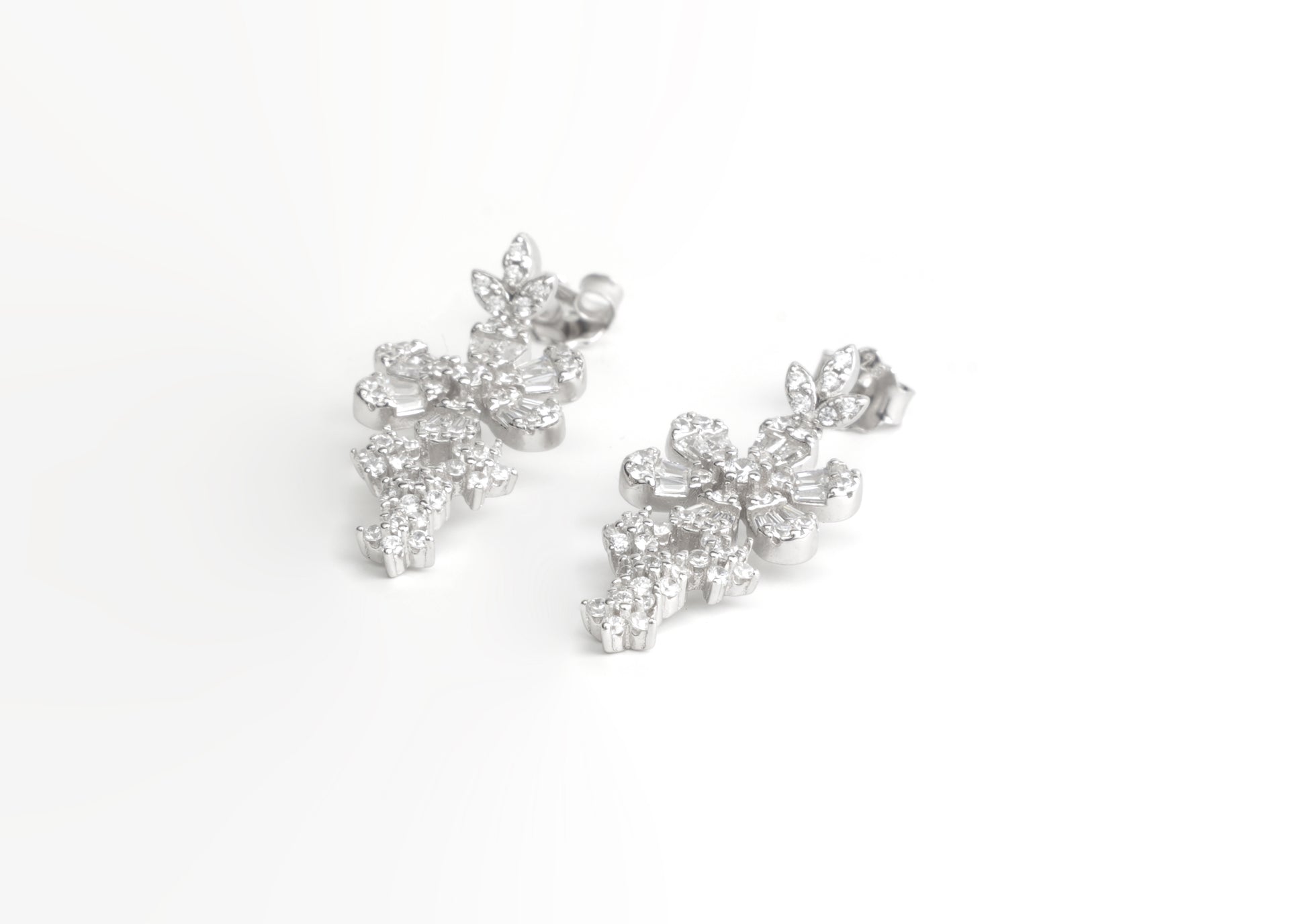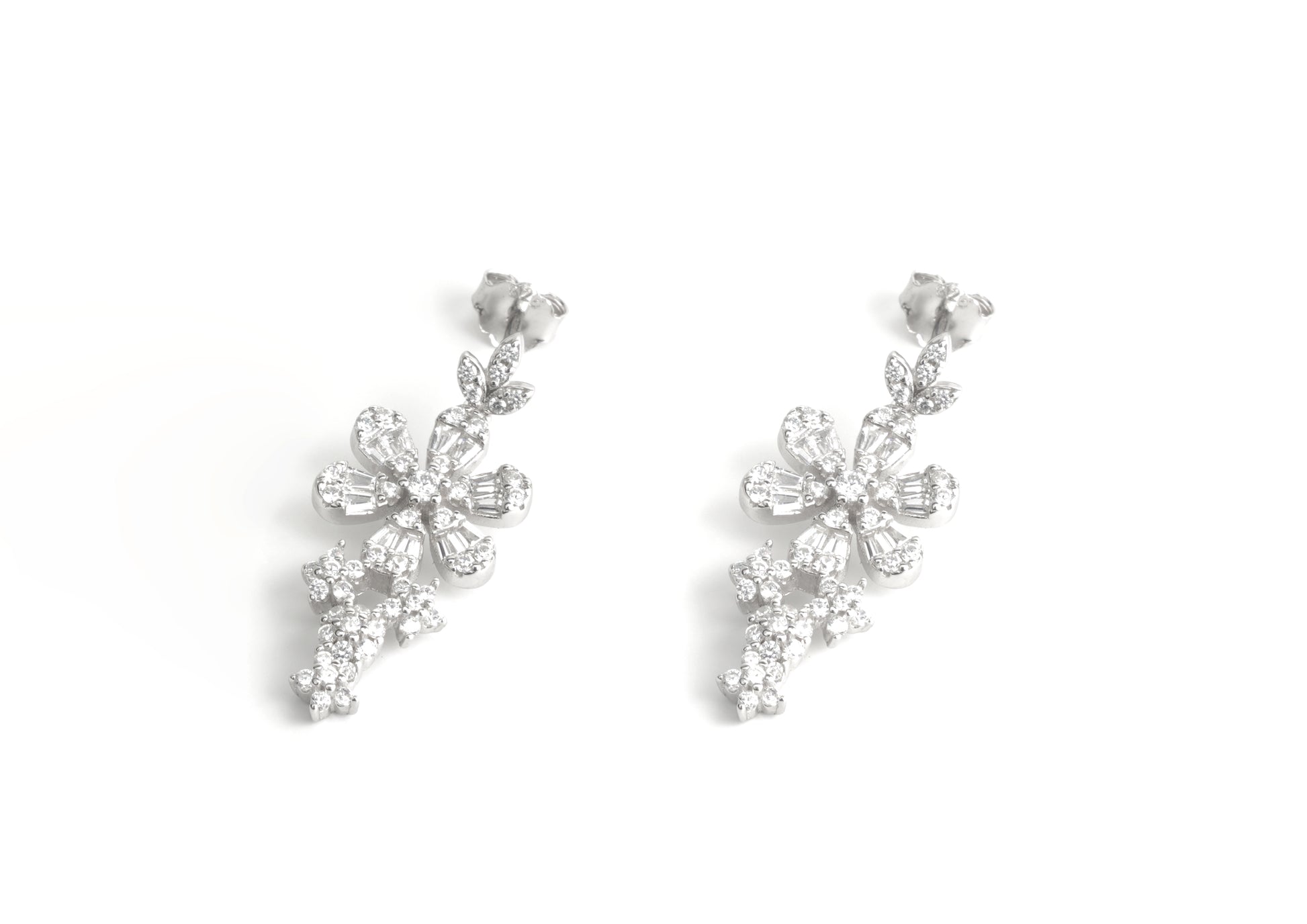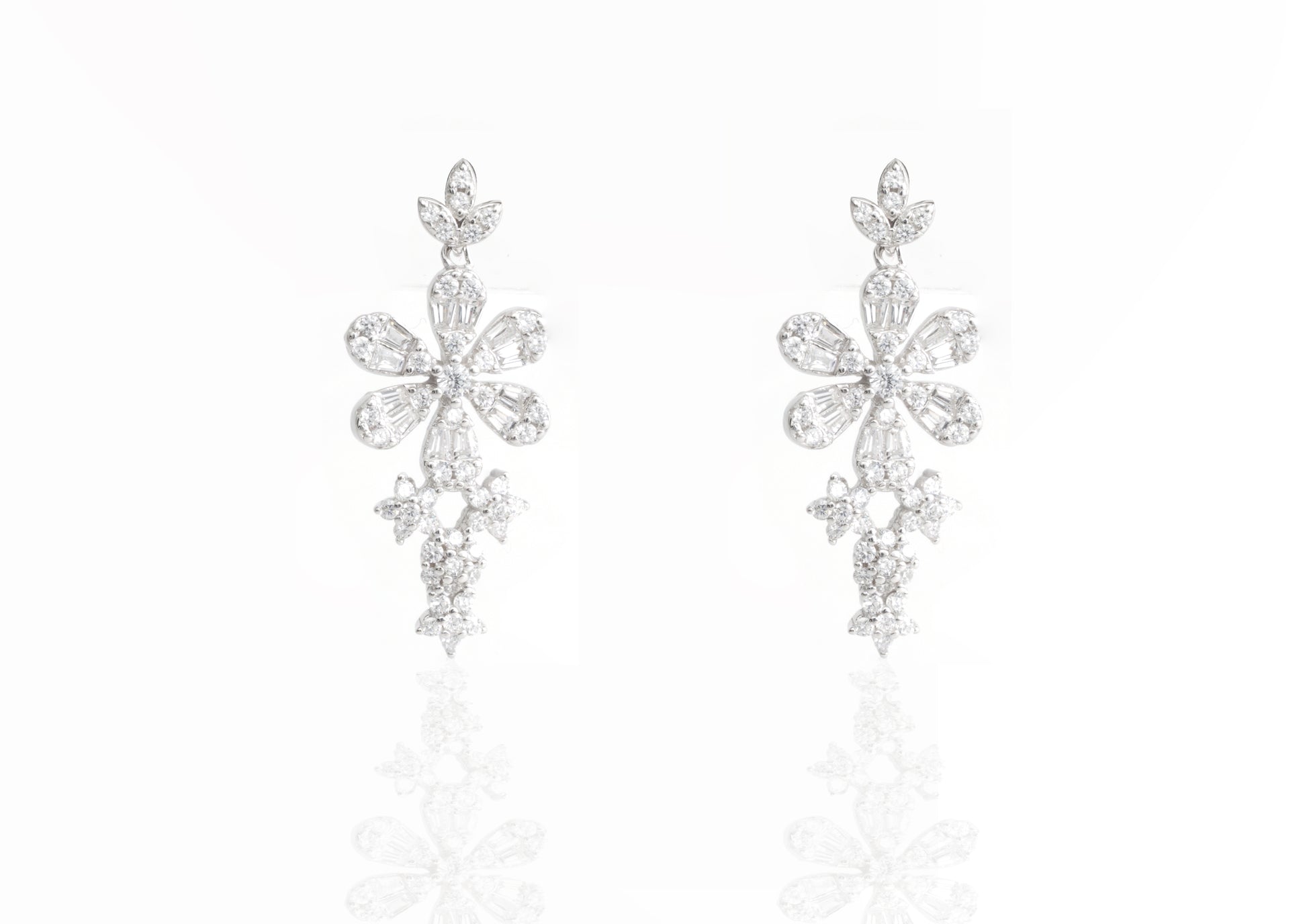 These exquisite Silver Floral Drop Earrings feature a stunning floral design with intricate cubic zirconia stones arranged in a flower shape, complemented by cascading smaller stone accents. The post-back style ensures a secure and comfortable fit, making them a perfect accessory to add a touch of elegance and natural beauty to any outfit, ideal for special occasions or evening wear.