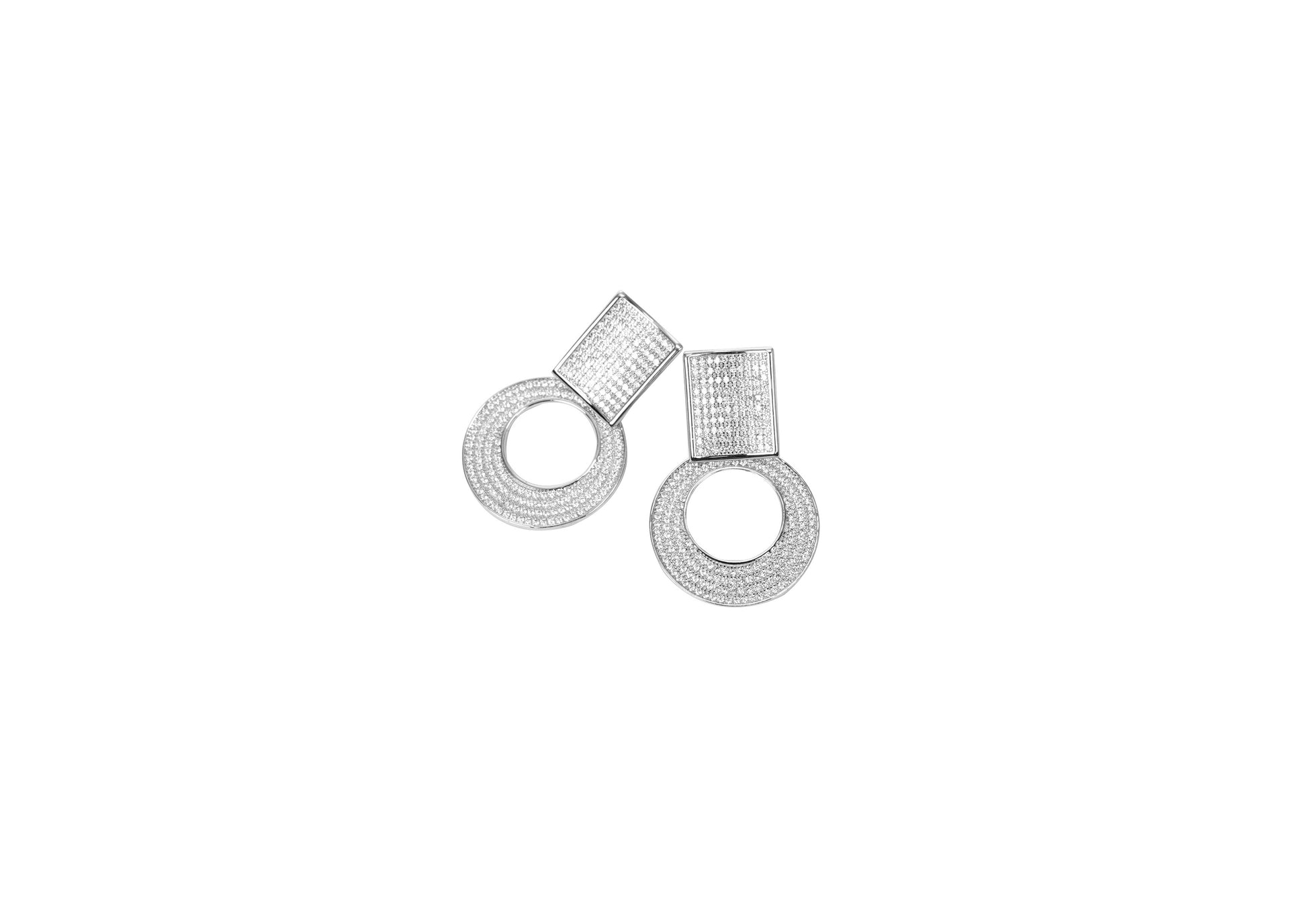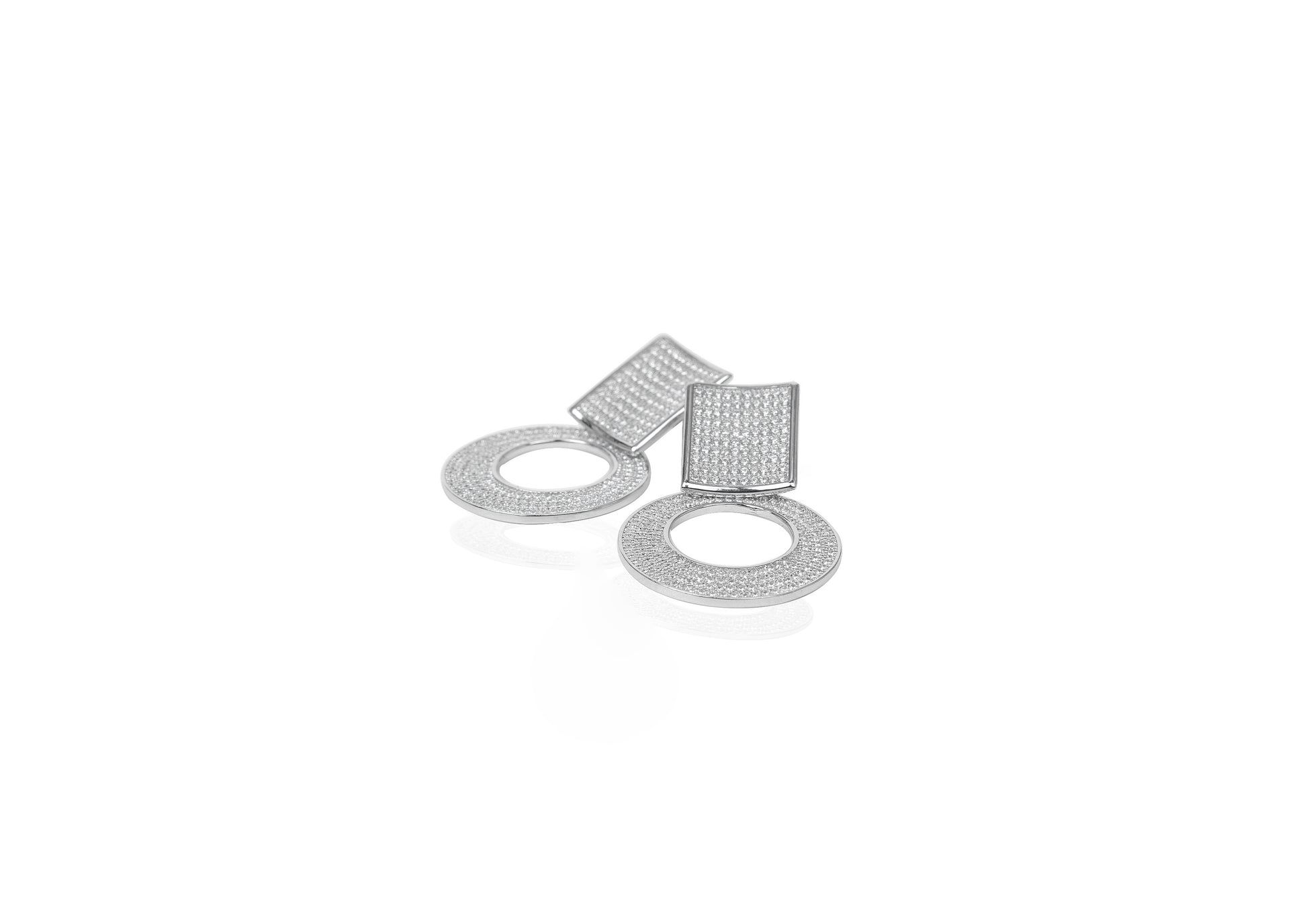 These elegant silver earrings feature a modern geometric design, combining a circular pendant with an open center and a rectangular top piece. Both elements are encrusted with small, sparkling stones, adding a touch of glamour. Perfect for both casual and formal occasions, these earrings offer a sleek, contemporary look with a luxurious finish. Crafted from high-quality silver, they are lightweight and comfortable for all-day wear.
