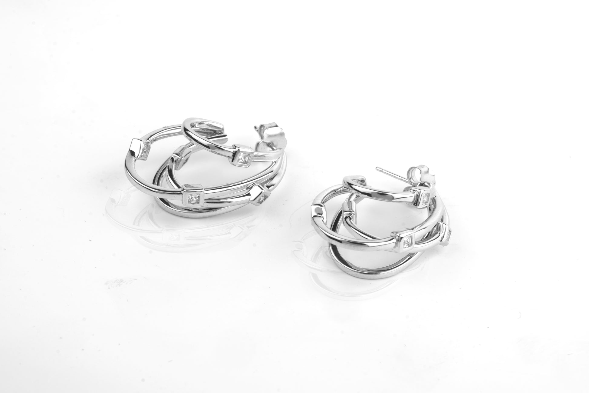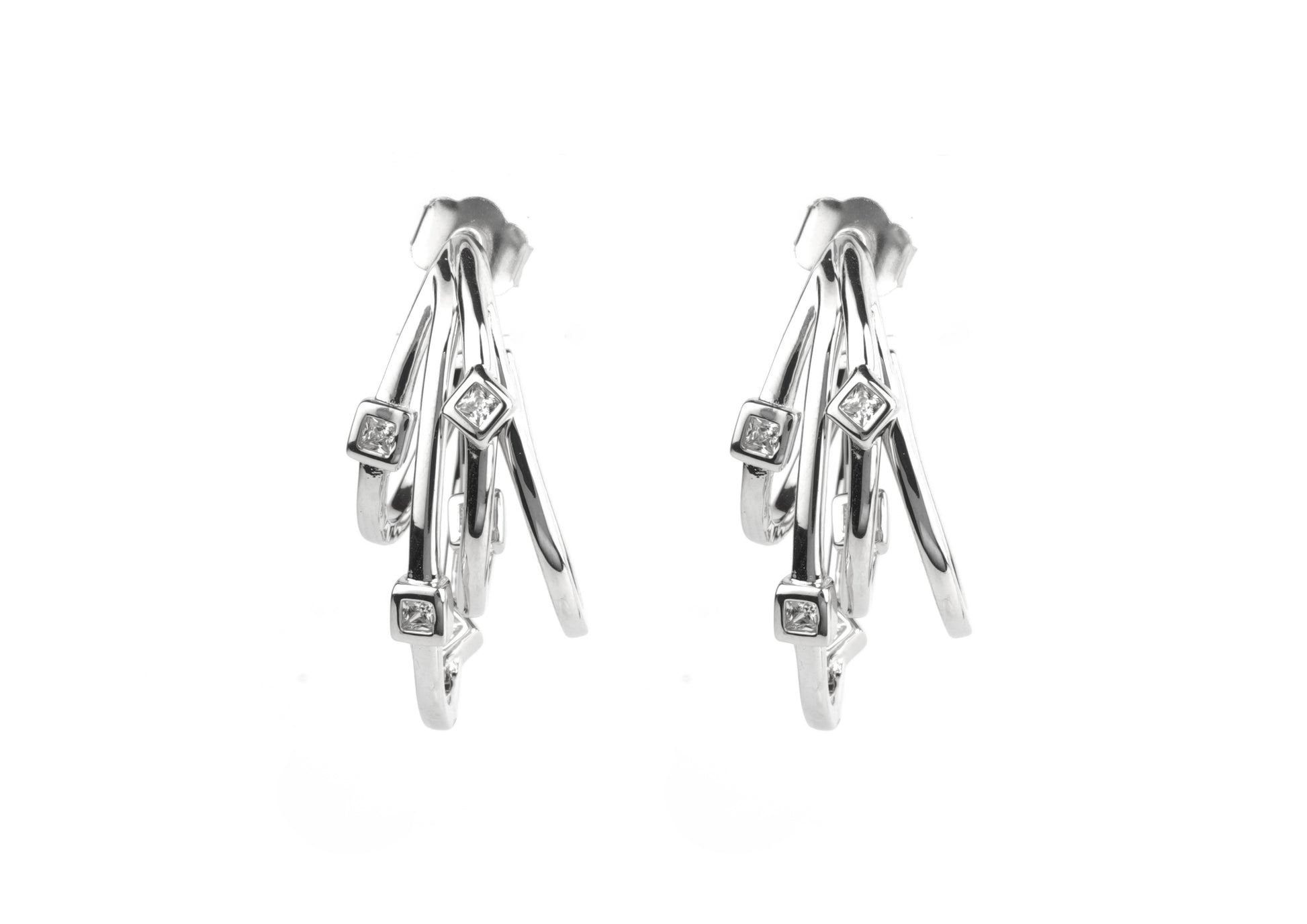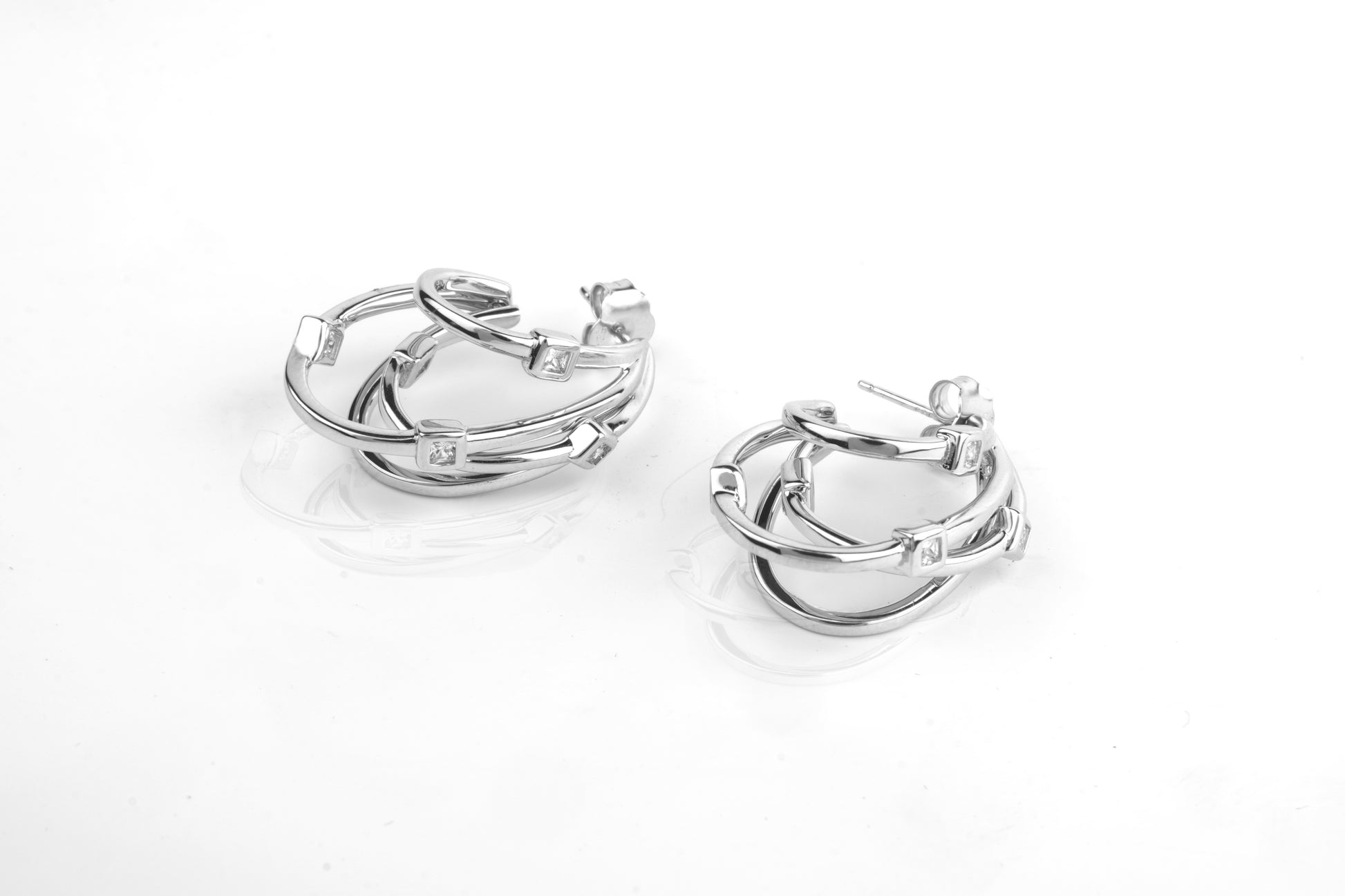 These sophisticated silver hoop earrings feature a unique intertwined design, with three curved bands weaving together to create a dynamic, layered look. Small, sparkling stones are delicately set at key points, adding a subtle shimmer to the sleek silver finish. Crafted from high-quality silver, these earrings combine modern artistry with timeless elegance, making them a versatile accessory for both casual and formal outfits. Their lightweight design ensures comfort for all-day wear.