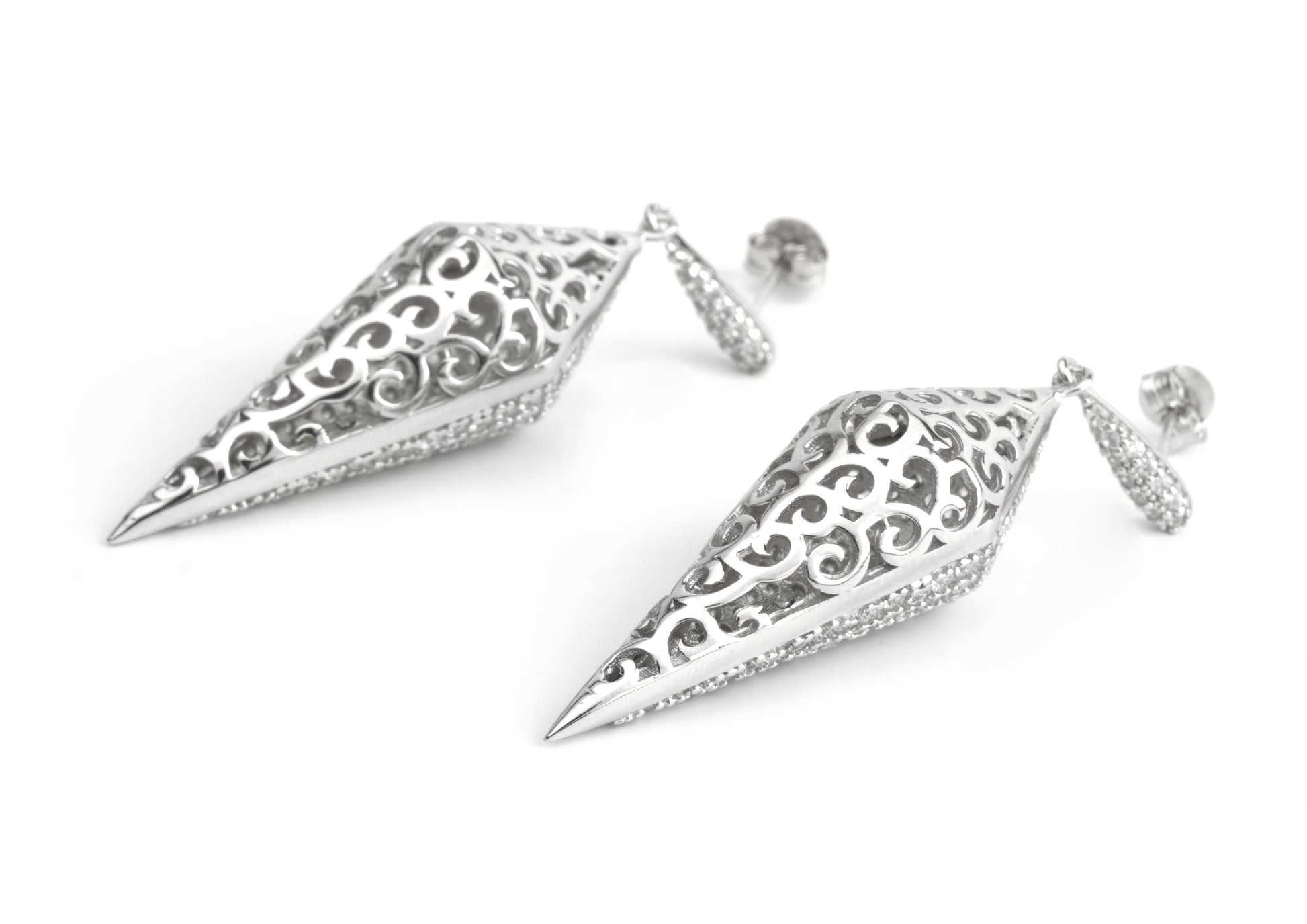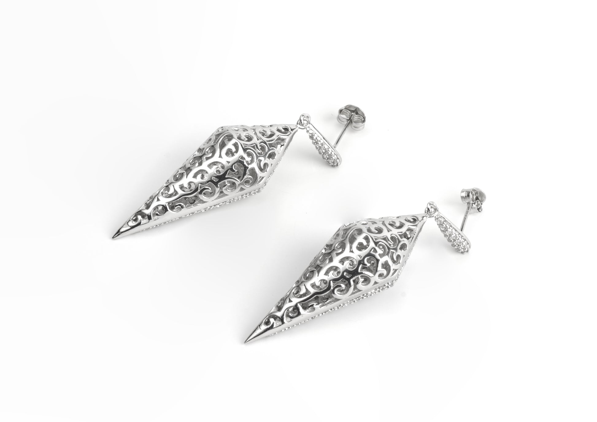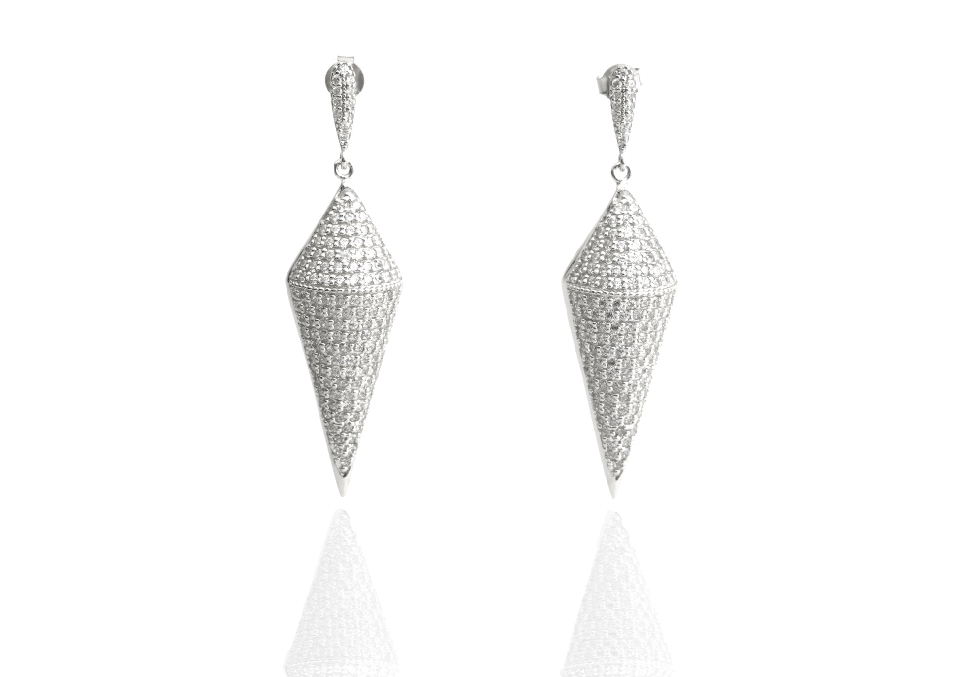 These bold silver dangle earrings feature a sleek, cone-shaped design fully encrusted with shimmering pave-set stones, creating a dazzling effect. The pointed pendants hang from a small, matching stud, adding a touch of modern elegance. Crafted from high-quality silver, these earrings offer a striking, contemporary look, perfect for adding a glamorous edge to both casual and formal outfits. Their lightweight design ensures comfort for extended wear.