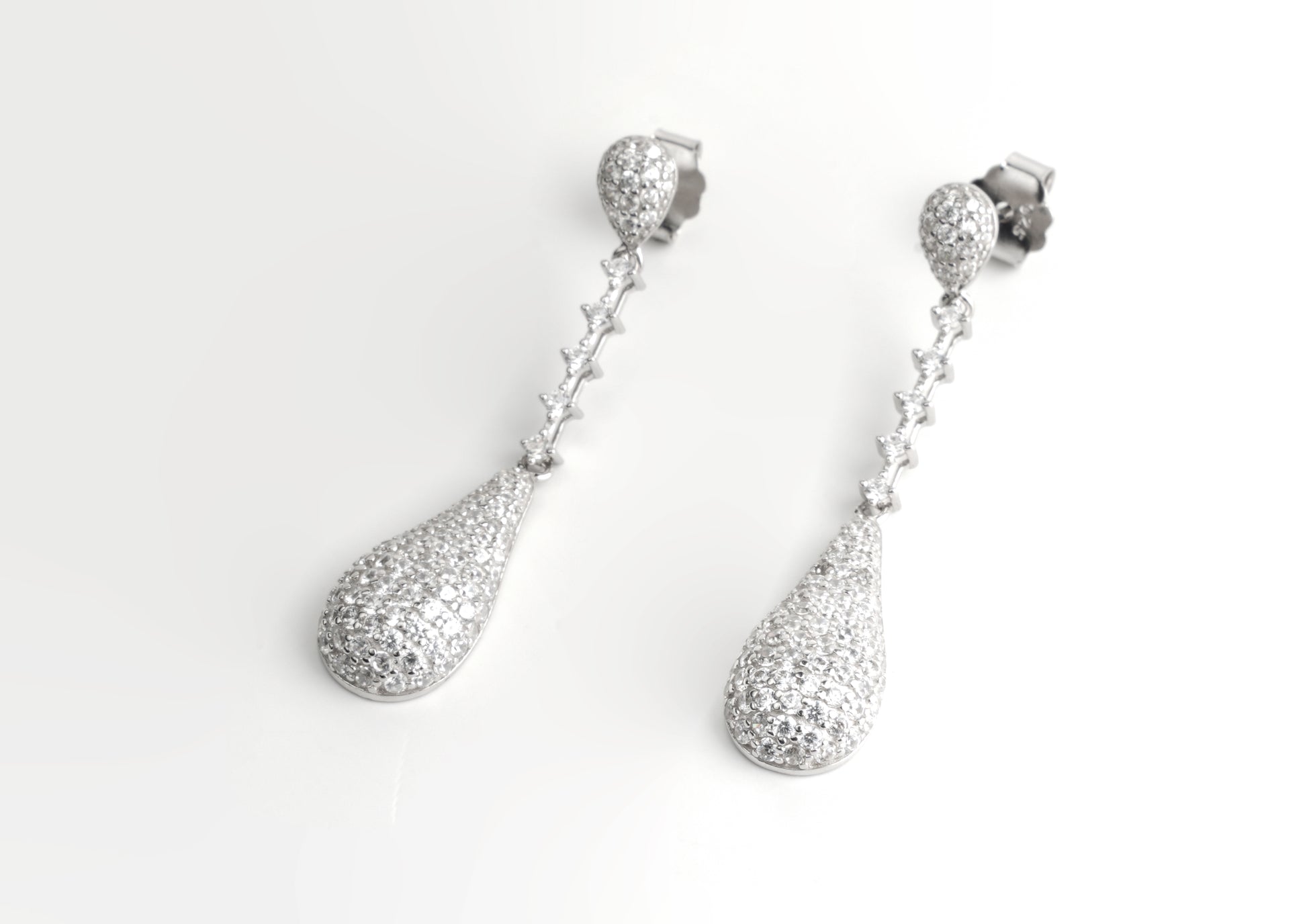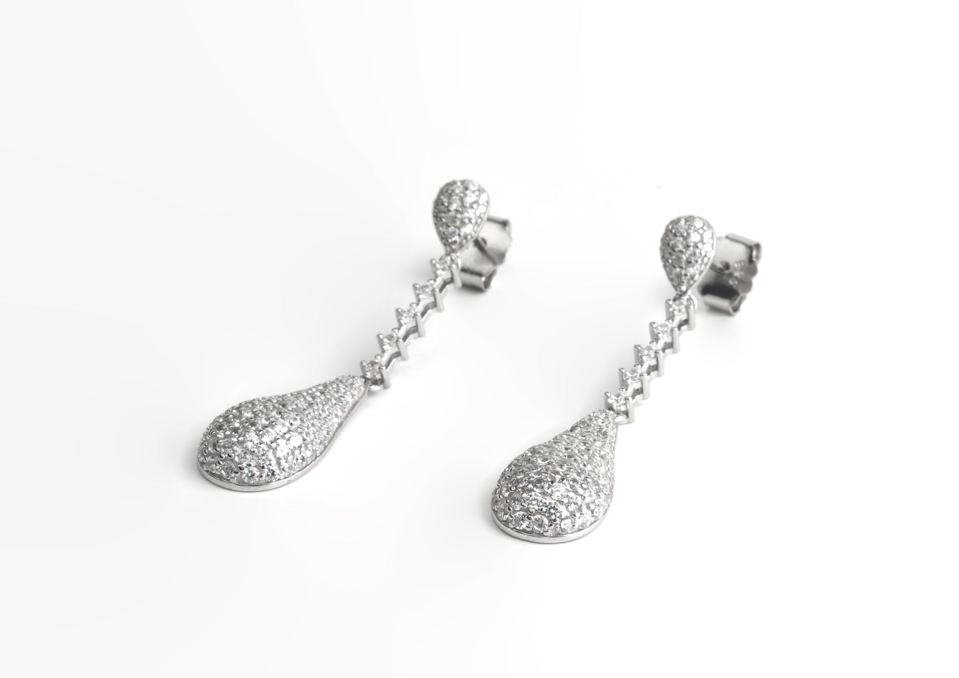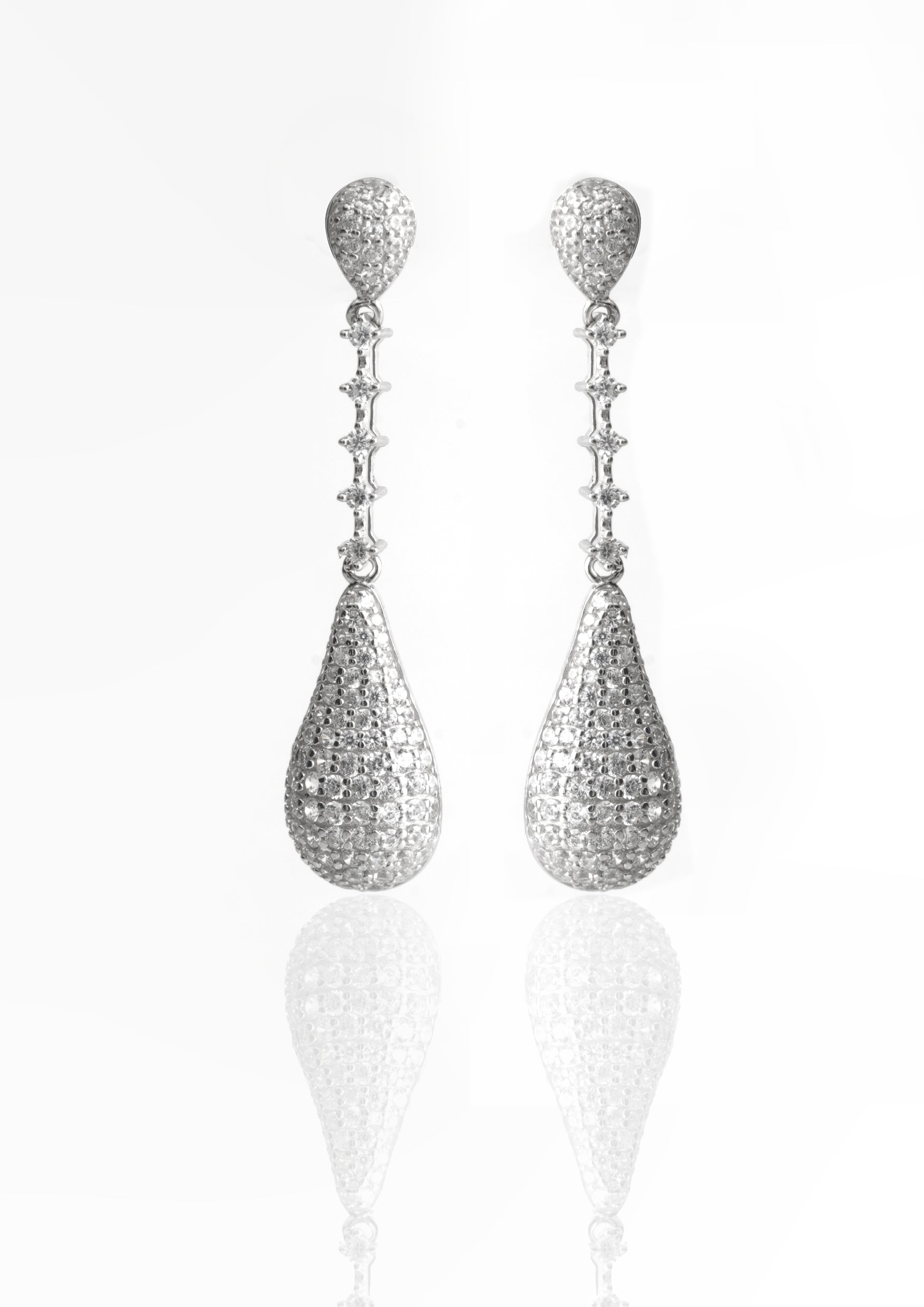 These elegant silver dangle earrings feature a cascading design with a small, pave-set teardrop stud at the top, followed by a series of three round gemstones linked together. The design culminates in a larger teardrop pendant, fully encrusted with shimmering pave stones for a dazzling effect. Crafted from high-quality silver, these earrings offer a sophisticated, glamorous look, perfect for formal occasions or adding a touch of sparkle to any outfit. They are lightweight for comfortable wear.