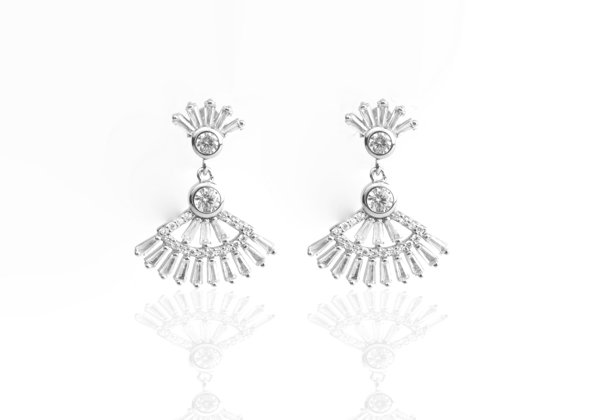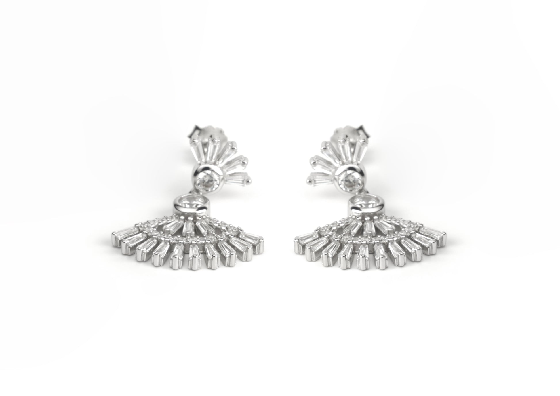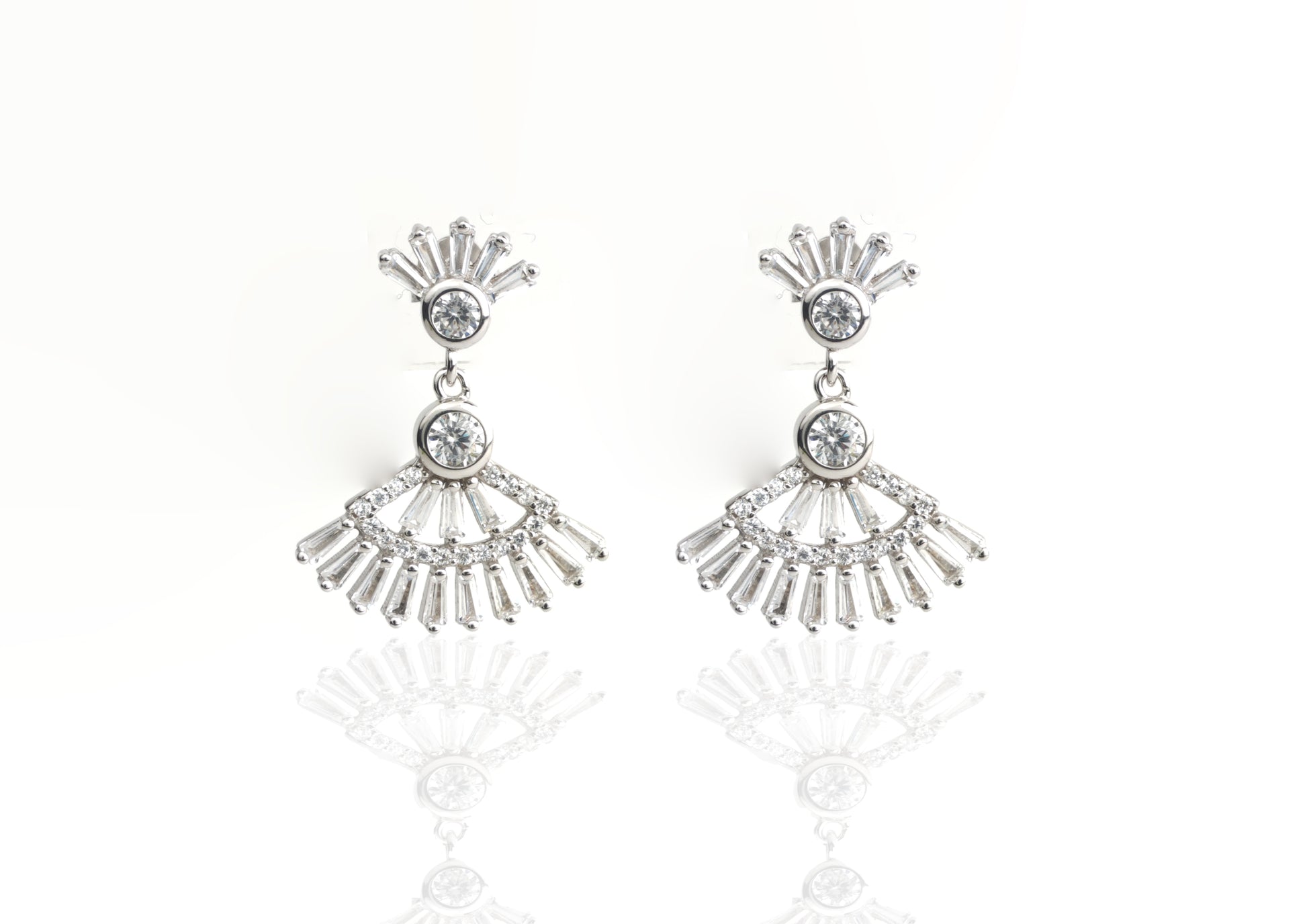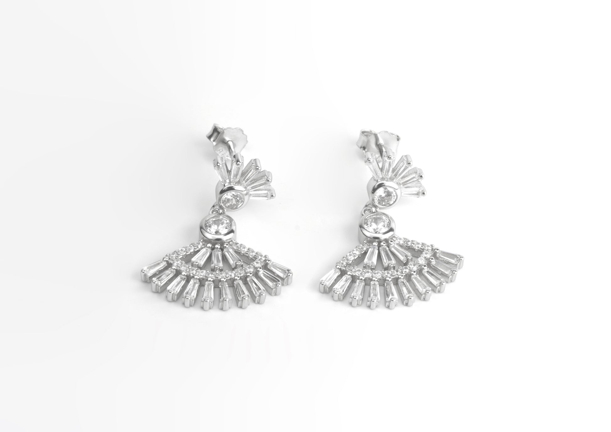 These elegant silver dangle earrings feature a striking fan-shaped design, with a semi-circle of elongated, radiant stones fanning out at the bottom. A round gemstone sits at the center of the fan, connected to a smaller, crown-like cluster of stones at the top. Crafted from high-quality silver, these earrings offer a glamorous yet delicate look, perfect for enhancing formal attire or adding sparkle to a special occasion outfit. They are lightweight for comfortable wear.