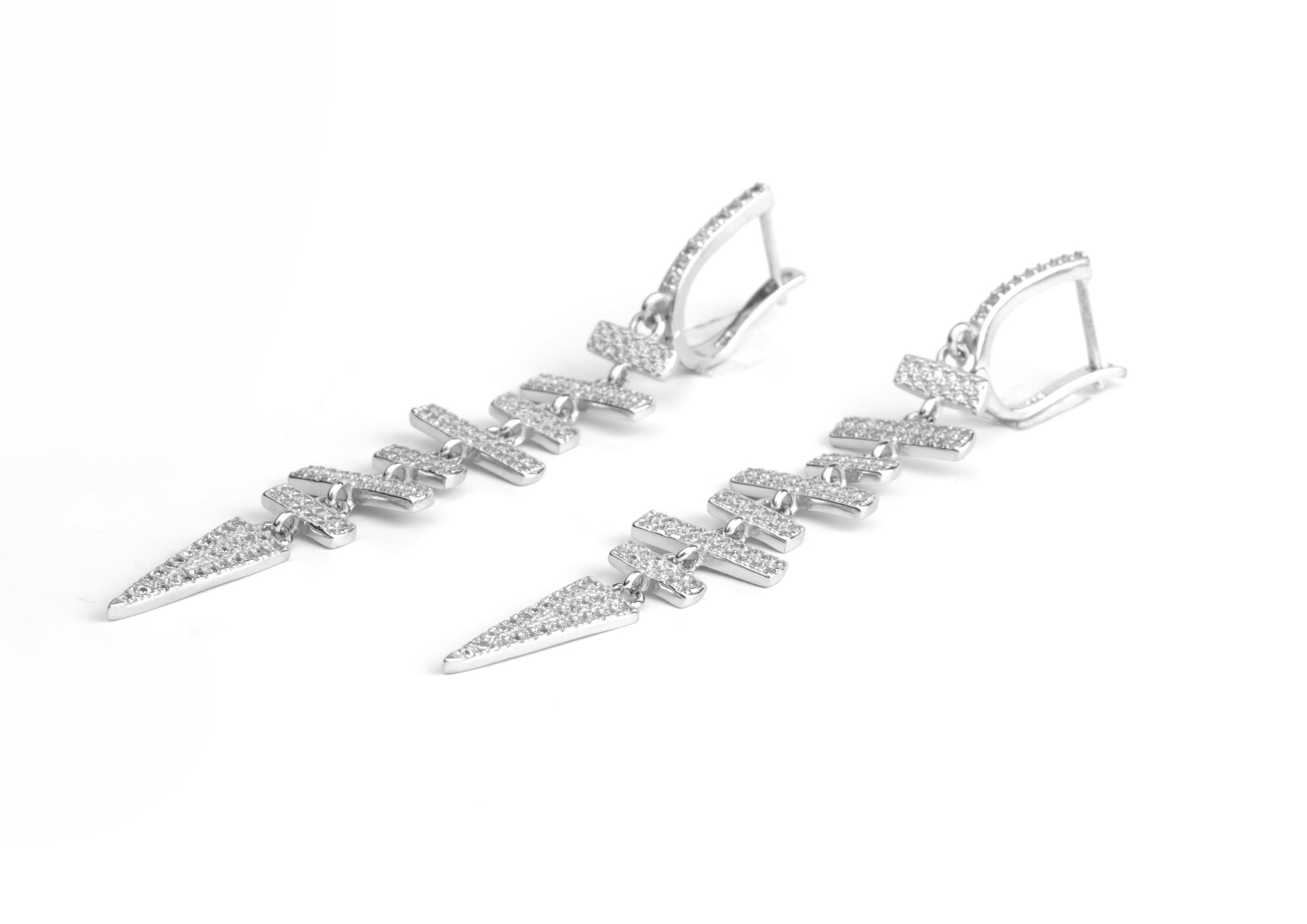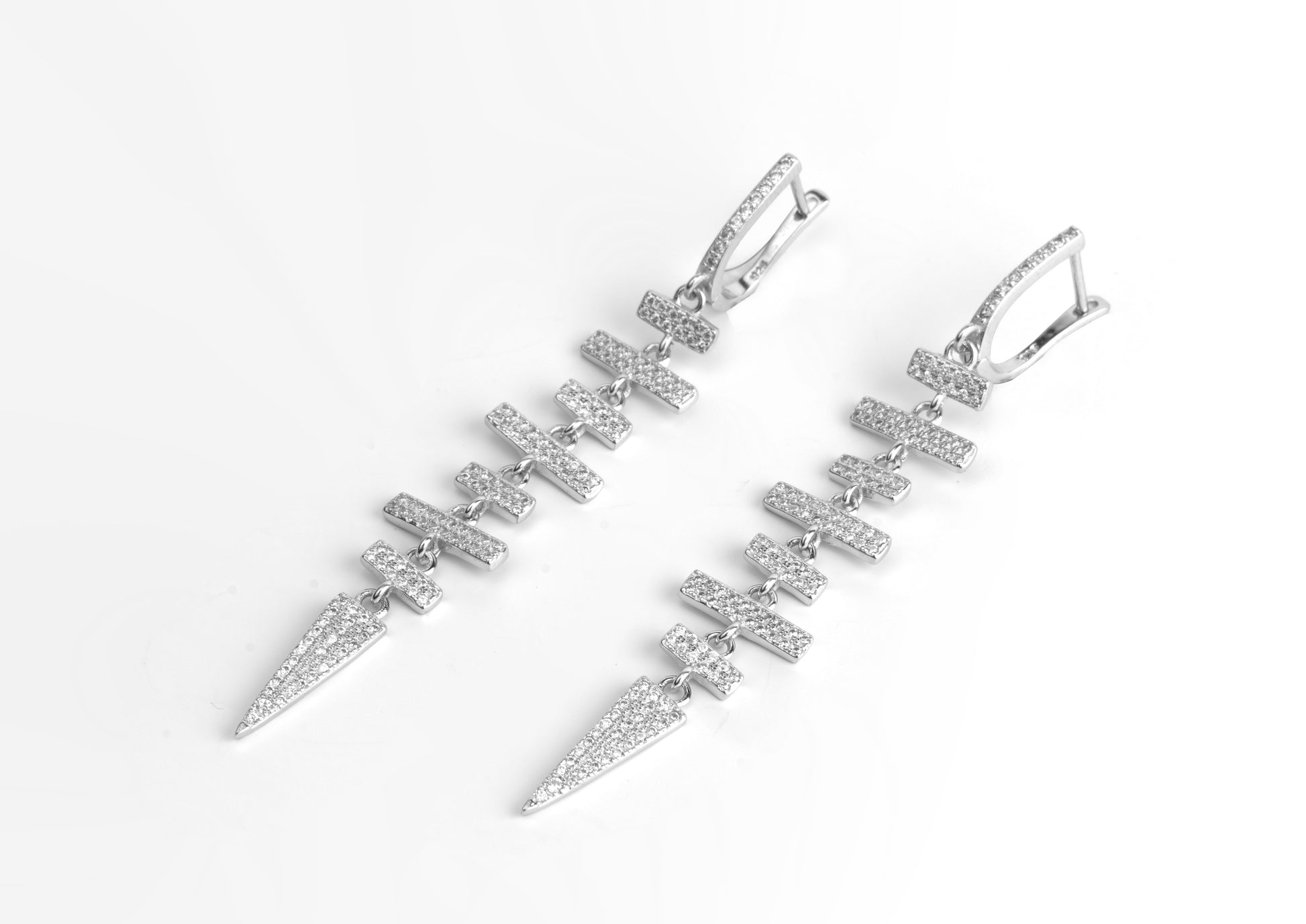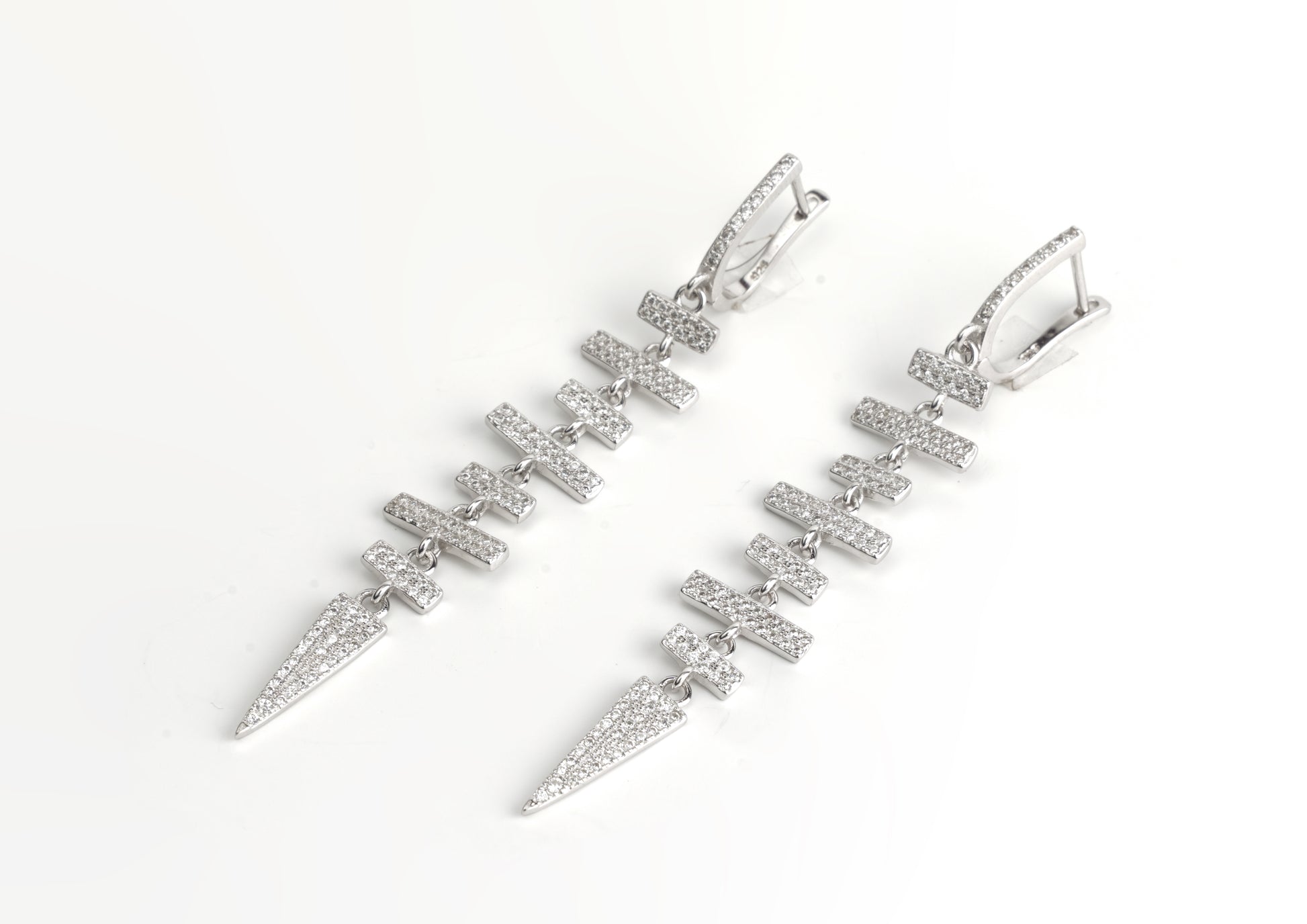 These striking silver dangle earrings feature a modern, tiered design with five rectangular segments, each encrusted with small, shimmering stones. The segments decrease in size as they descend, culminating in a pointed, spike-shaped pendant that adds a bold edge. Crafted from high-quality silver, these earrings offer a sleek, contemporary look, perfect for making a statement at any event. Their lightweight construction ensures comfort during extended wear.