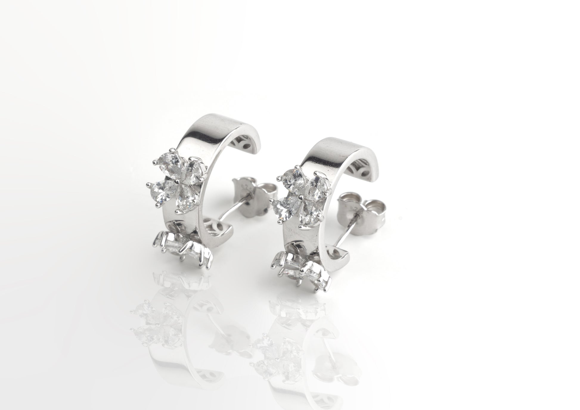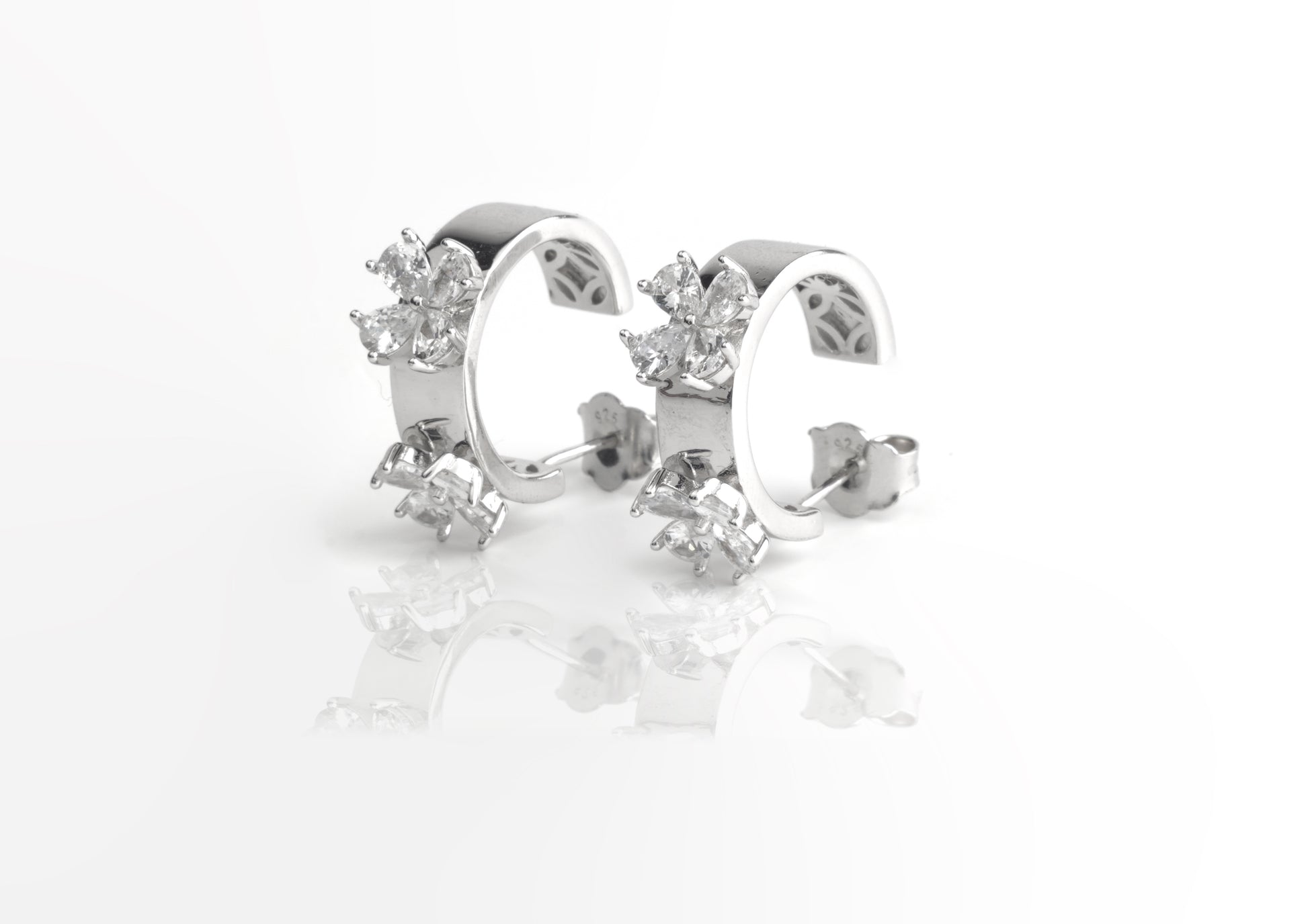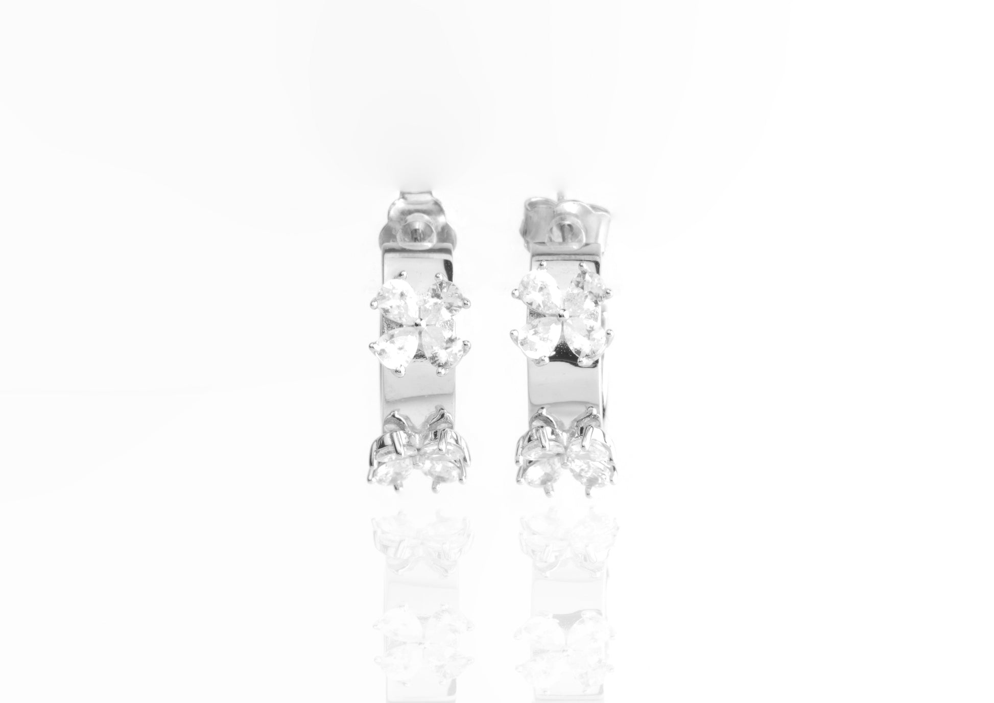 These chic Sterling Silver Cluster Hoop Earrings are crafted entirely from polished sterling silver, featuring a sleek, curved hoop design. Each earring is adorned with a cluster of sparkling white gemstones, likely cubic zirconia or diamonds, set in a floral-inspired arrangement. The combination of the smooth silver hoop and the dazzling gemstone cluster creates a modern yet timeless look, perfect for both everyday wear and special occasions. These earrings offer a sophisticated touch of elegance with a minimalist aesthetic.
