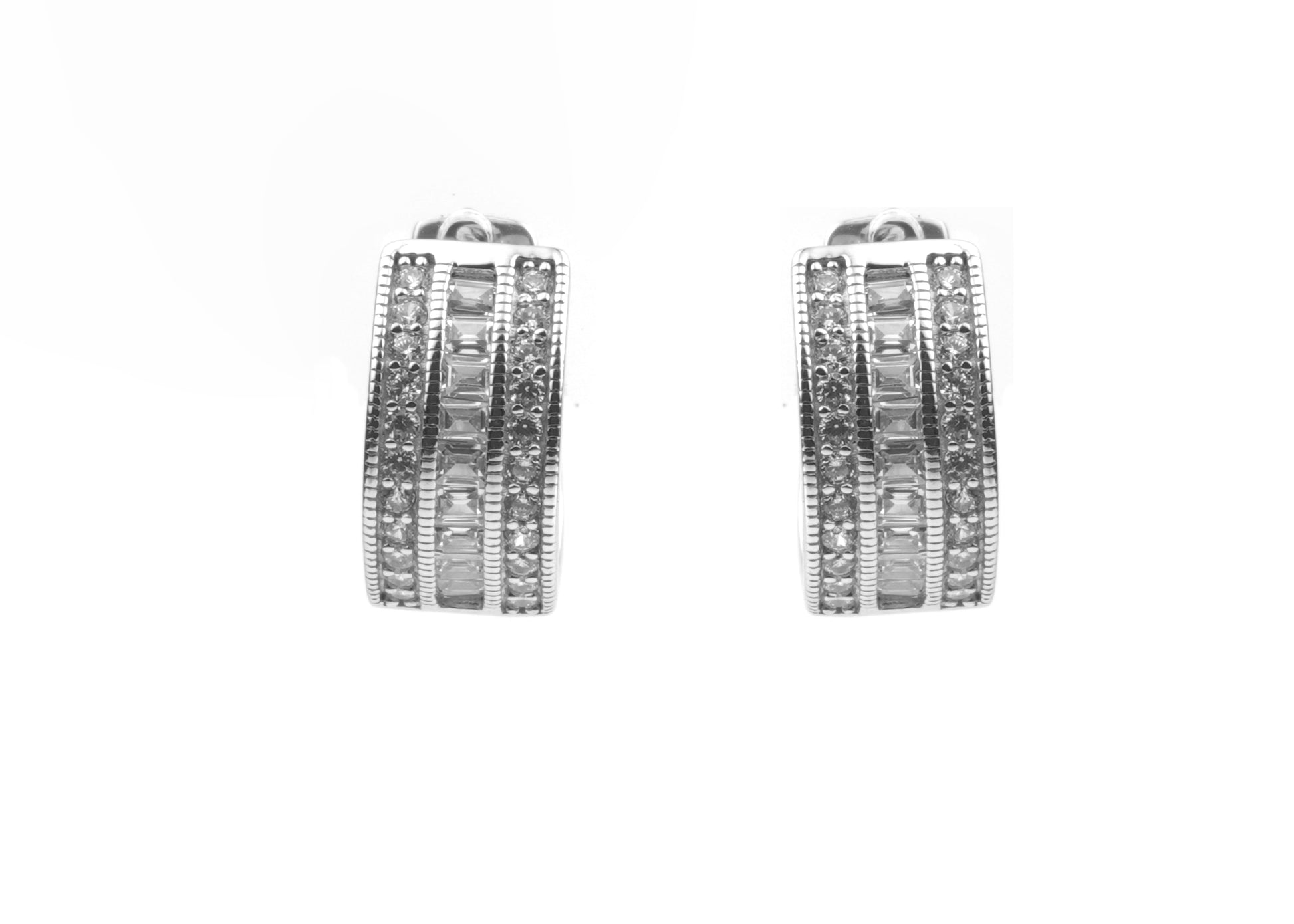 These luxurious sterling silver hoop earrings feature a double-row design, encrusted with sparkling cubic zirconia stones for a dazzling effect. The intricate cut-out pattern adds a unique touch, making them a perfect accessory for elevating any ensemble with timeless elegance.