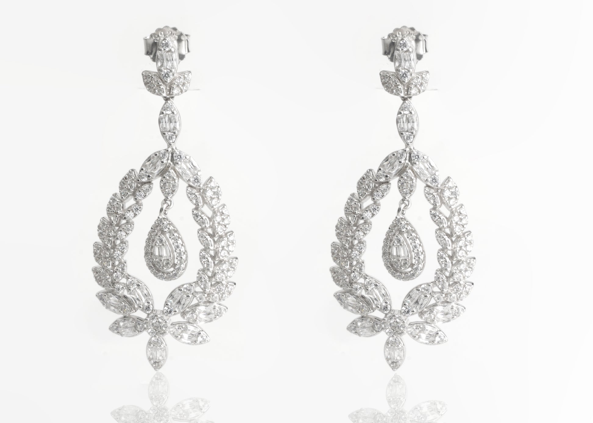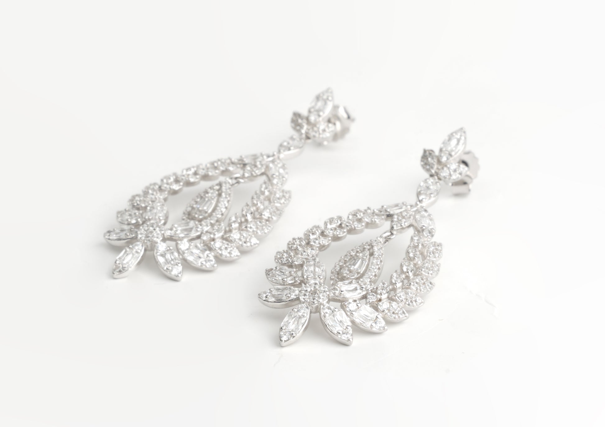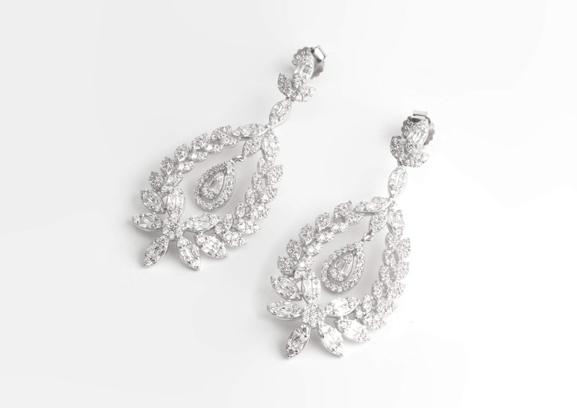 These luxurious Sterling Silver Floral Chandelier Earrings are expertly crafted from polished sterling silver, showcasing an intricate floral-inspired design. Each earring features a cascade of sparkling white gemstones, likely cubic zirconia or diamonds, arranged in a leaf-like pattern surrounding a central pear-shaped gemstone. The detailed setting and dangling elements create a sense of movement and elegance, making these earrings a stunning choice for formal events, weddings, or as a glamorous statement piece for any special occasion.
