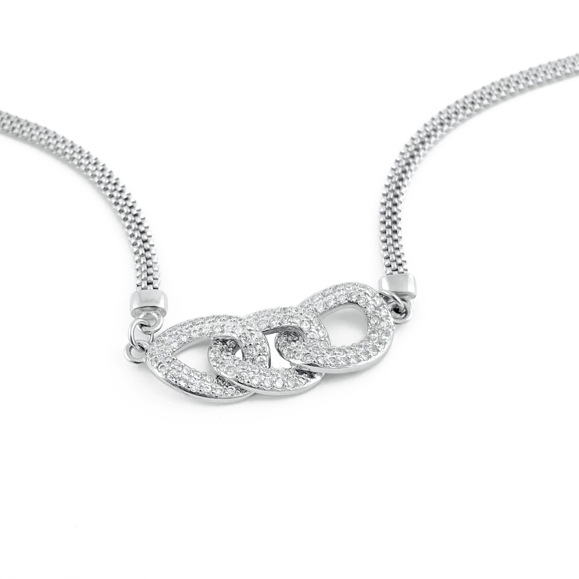 Add a touch of sophistication to your look with this stunning 925 sterling silver interlinked chain. Featuring three beautifully crafted pave-set links, this elegant chain is designed for those who appreciate fine craftsmanship and timeless style. The dual-strand chain enhances its luxurious appeal, making it perfect for both everyday wear and special occasions. Crafted from high-quality sterling silver, it ensures durability and a lasting shine. A must-have addition to your jewelry collection!