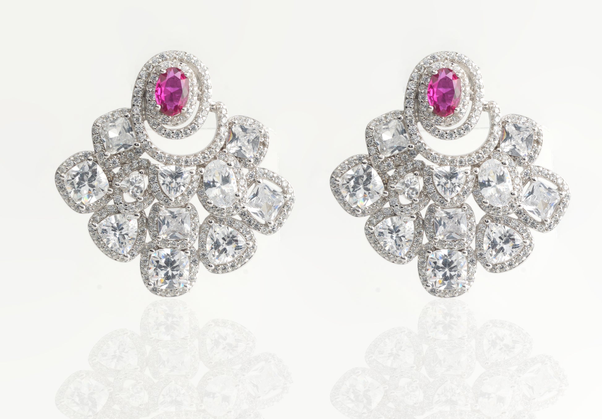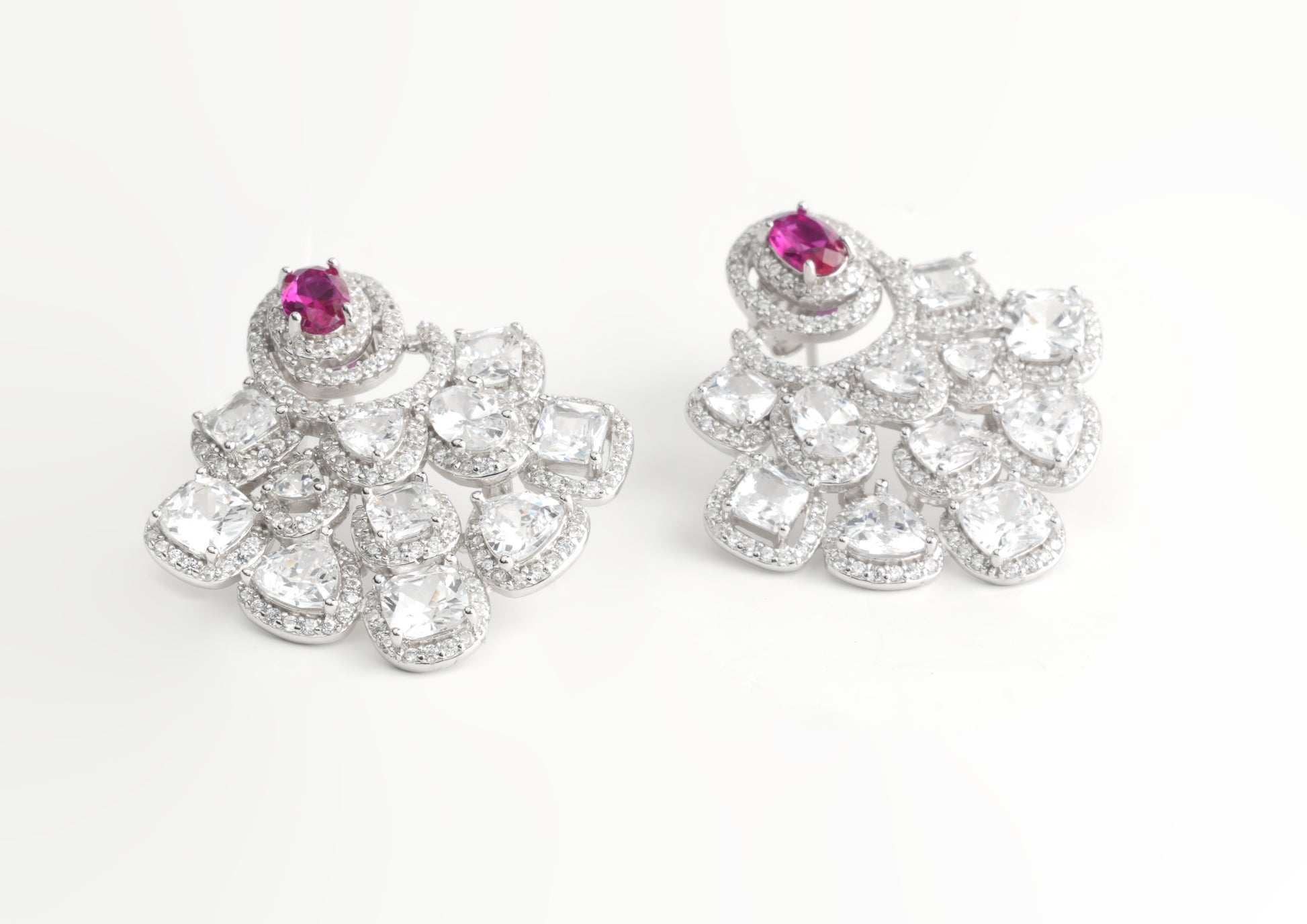 These opulent Sterling Silver Ruby Cluster Earrings are crafted entirely from polished sterling silver, featuring a bold, clustered design. Each earring is centered with a vibrant, oval-cut ruby gemstone, surrounded by a halo of sparkling white gemstones, likely cubic zirconia or diamonds. The lower section showcases a cluster of large, faceted white gemstones in various shapes, set in a floral-inspired arrangement, all framed by smaller pave-set stones. These earrings are a perfect blend of luxury and elegance, ideal for making a striking statement at formal events or special occasions.