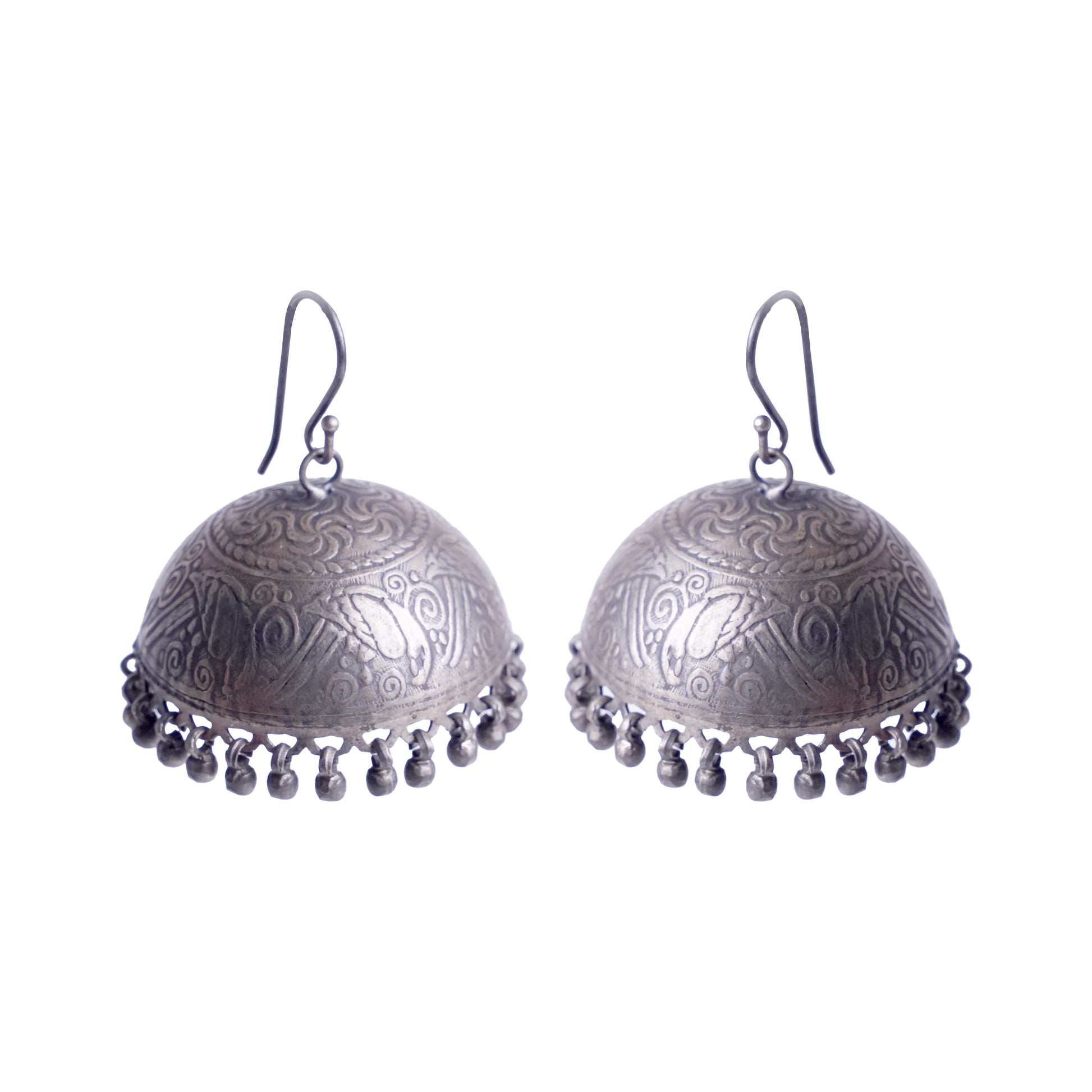 Bold, rustic, and timeless — these oxidized silver jhumkas feature an exquisitely engraved dome with tribal-inspired motifs and classic ghungroo detailing. A statement piece that speaks of heritage and strength, these jhumkas are perfect for earthy, boho, or ethnic looks. Crafted in pure silver, they bring elegance with an edge.
